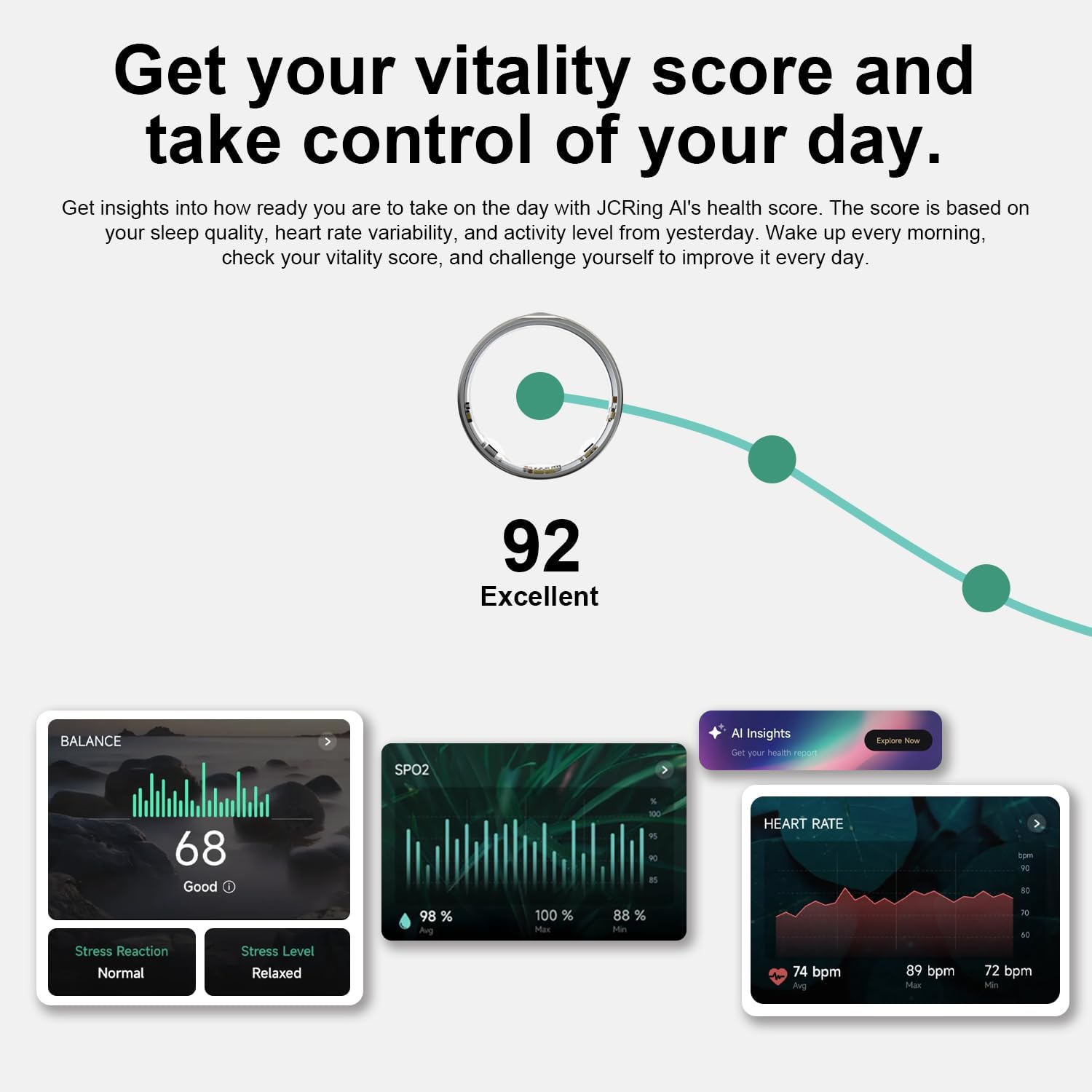【Waterproof and durable – widely compatible】JCRing has excellent 5ATM waterproof performance, which can work normally within 350 feet in depth, allowing you to wear it without worry during swimming, diving, or shower. At the same time, it also supports equipment of Android and iOS to ensure that no matter what kind of mobile phone you use. In the future, we will also integrate with more health applications to provide you with a richer functional experience.