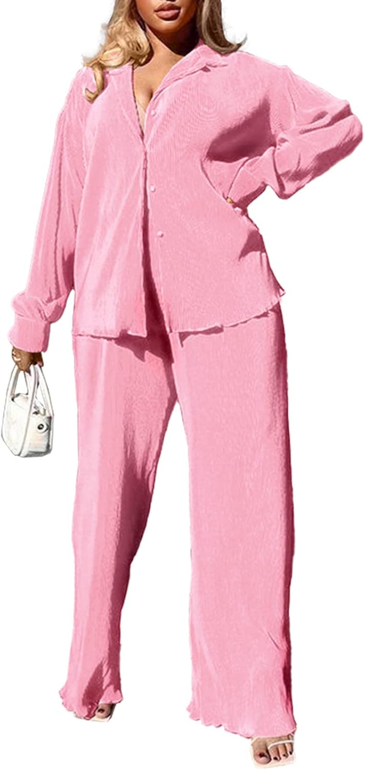 Long Sleeve Button Down Shirt + Flare Pleated Wide Leg Pants Sets Streetwear