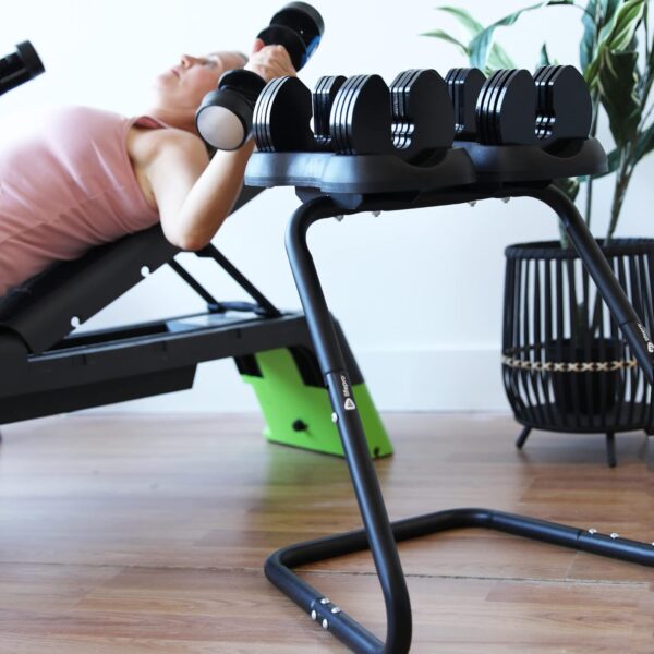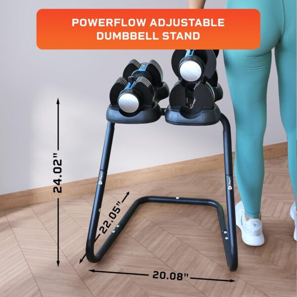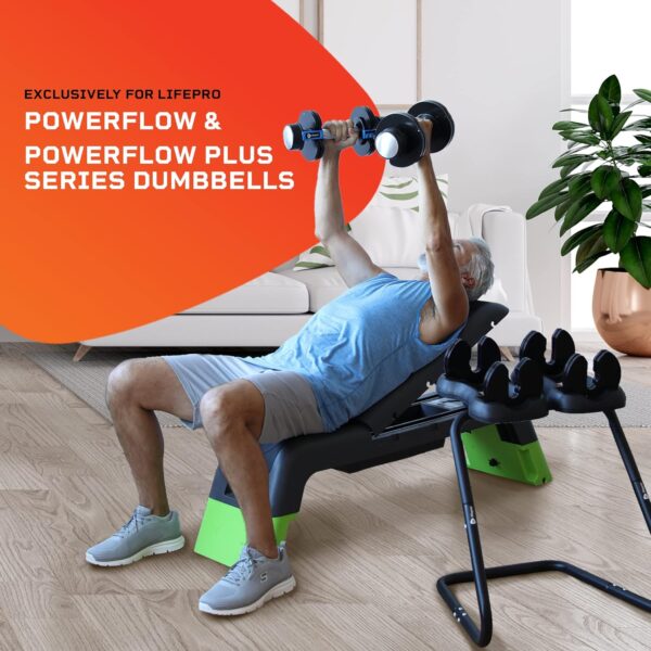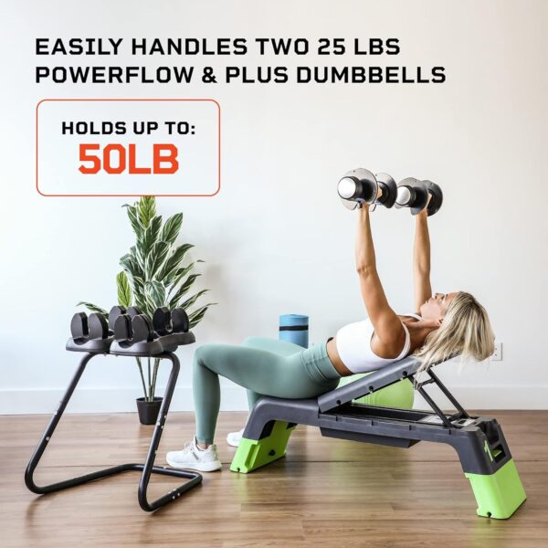 FOR POWERFLOW & POWERFLOW PLUS ADJUSTABLE DUMBBELLS (Dumbbells not Included) – Made exclusively to hold the PowerFlow & PowerFlow Plus dumbbell sets adjustable weights, the dumbbell stand makes your training sessions safer, & your home gym less cluttered.