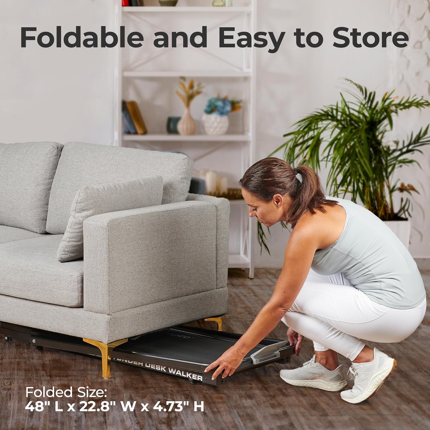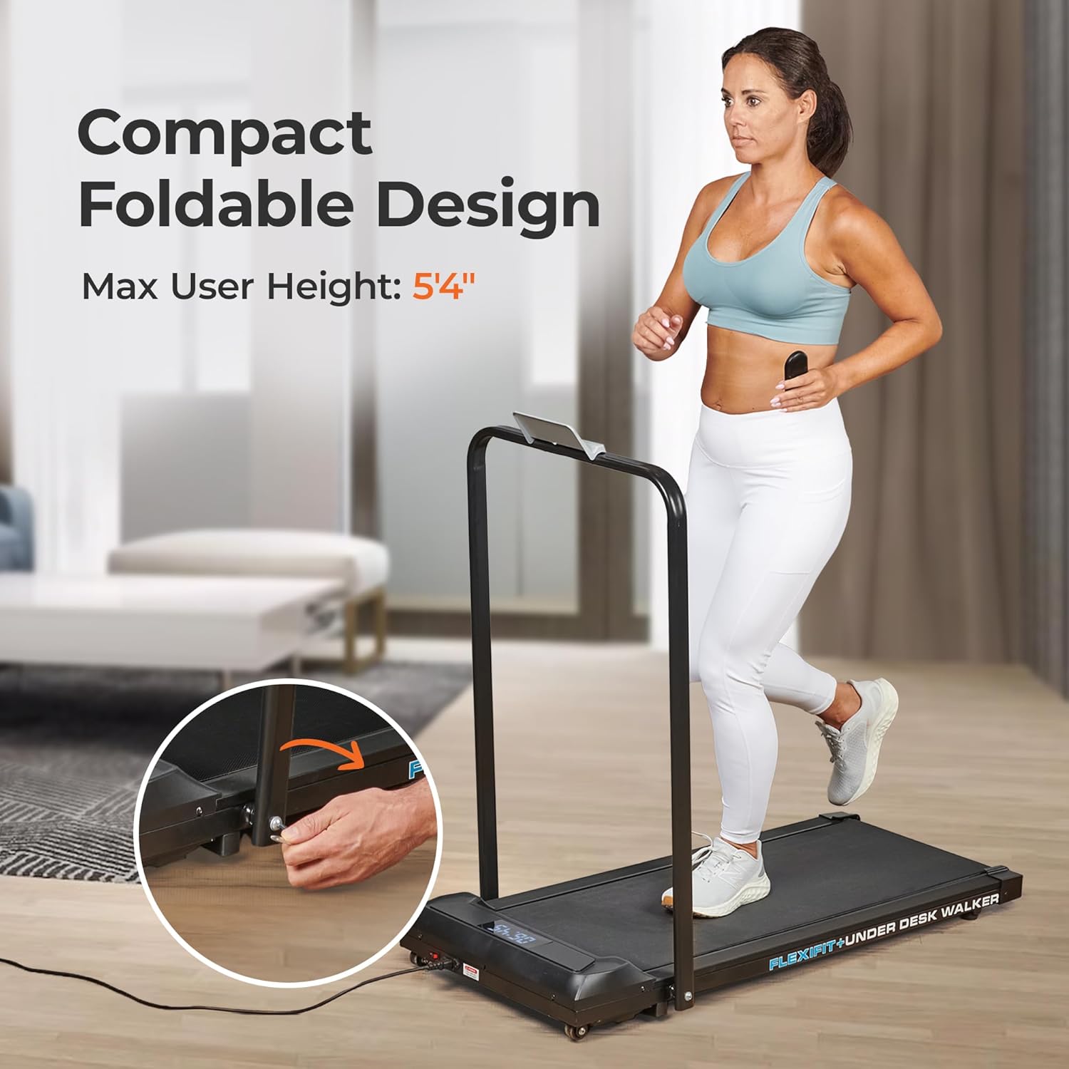 Compact and Convenient: Our walking pad under desk treadmill for home use is perfect for small spaces, fitting seamlessly under your standing desk. FlexiFit + Under Desk Walker, with a slim design and foldable handlebar, easily tucks away under a bed or couch.
