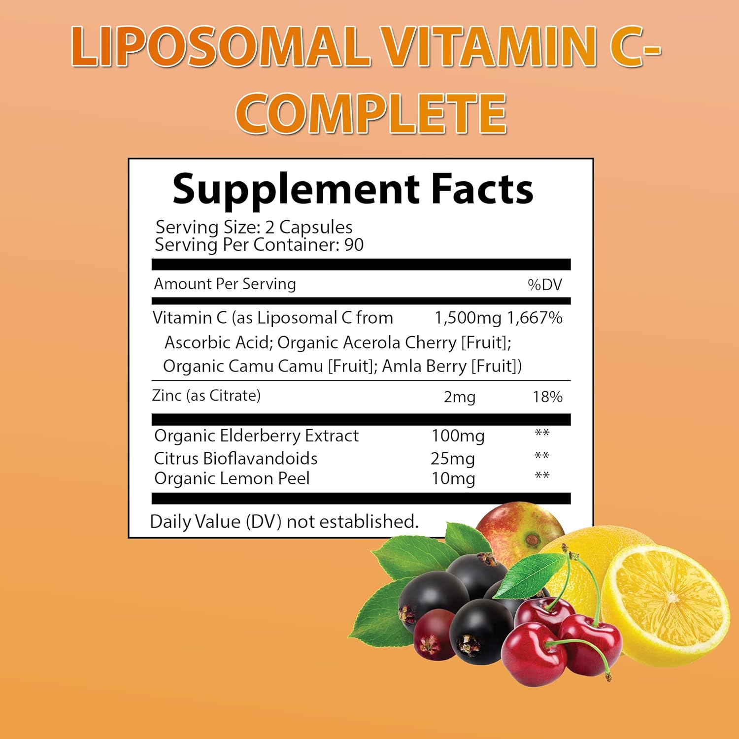 COMPLETE VITAMIN C FORMULA: With Zinc, Organic Elderberry, Acerola Cherry, Camu Camu, Amla Berry & Bioflavanoids that increase absorbtion of ascorbic acid. Give your immune system a powerful emergency C boost it needs. Don’t settle for 500 mg or 1000 mg Liposomal C supplements. All – in – one Vitamin C supplement is just for you. Each bottle contains easy to swallow 180 Vegetable Capsules (plant-derived) for a full 3 month supply. Regular Vitamin C cannot compete.