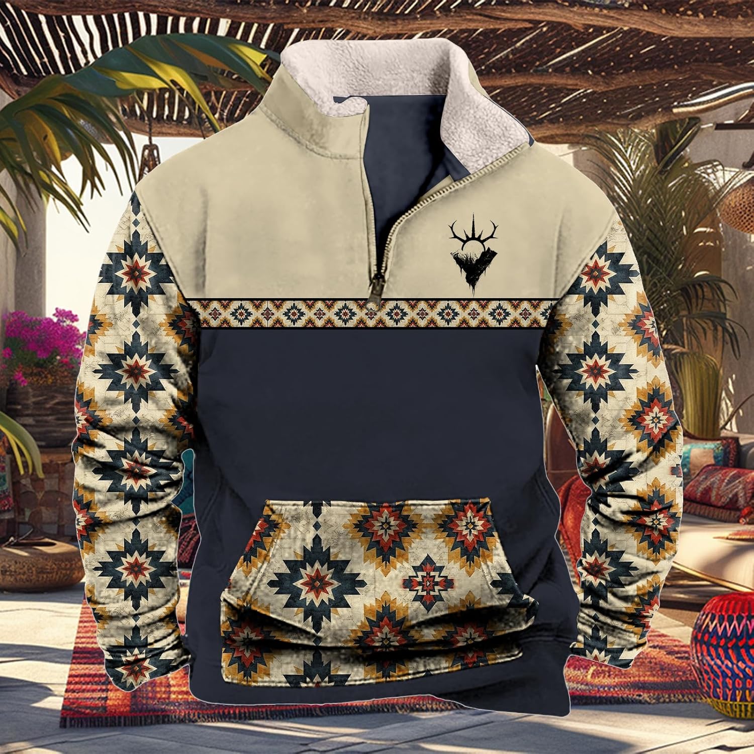MARSVOVO Cowboy Hoodies Tribal Western Tops Aztec Print 1/4 Zip Pullover Y2k Spring Fall Casual Sweatshirt with Pockets