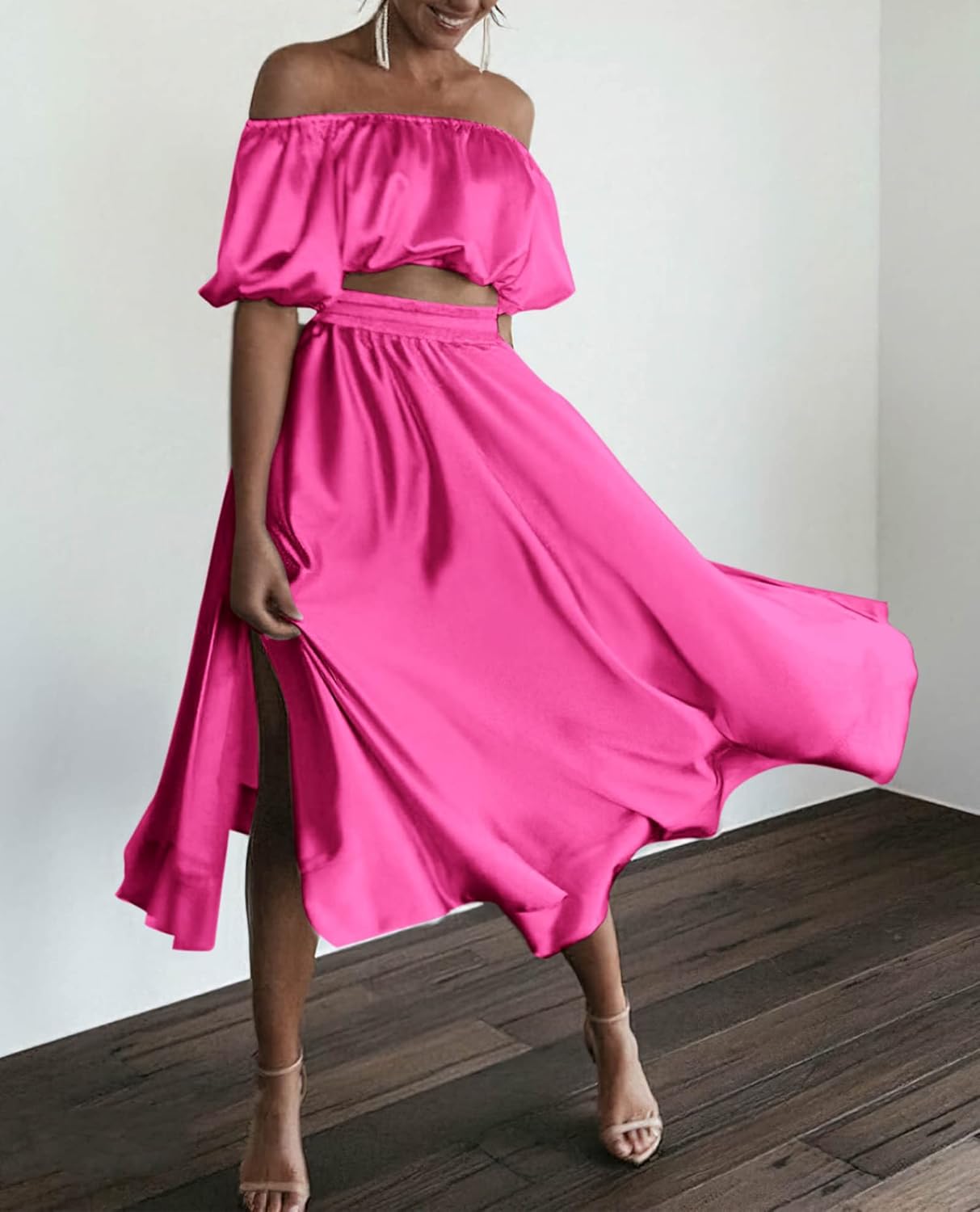 Summer outfits for women 2 piece set includes satin crop top and long maxi skirt.Two kind of wearing styles for the womens tops,pull down to wear as off the shoulder tops or pull up as puff sleeve top.Maxi skirts are with pockets,offering convenience to put down your phone and keys.