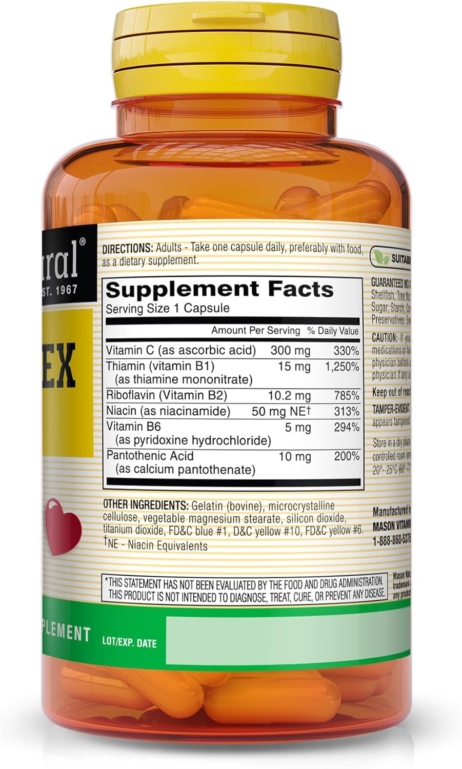 MASON NATURAL Vitamin B-Complex with Vitamin C – Healthy Heart and Nervous System, Improves Immune Function and Energy Metabolism, 100 Capsules
