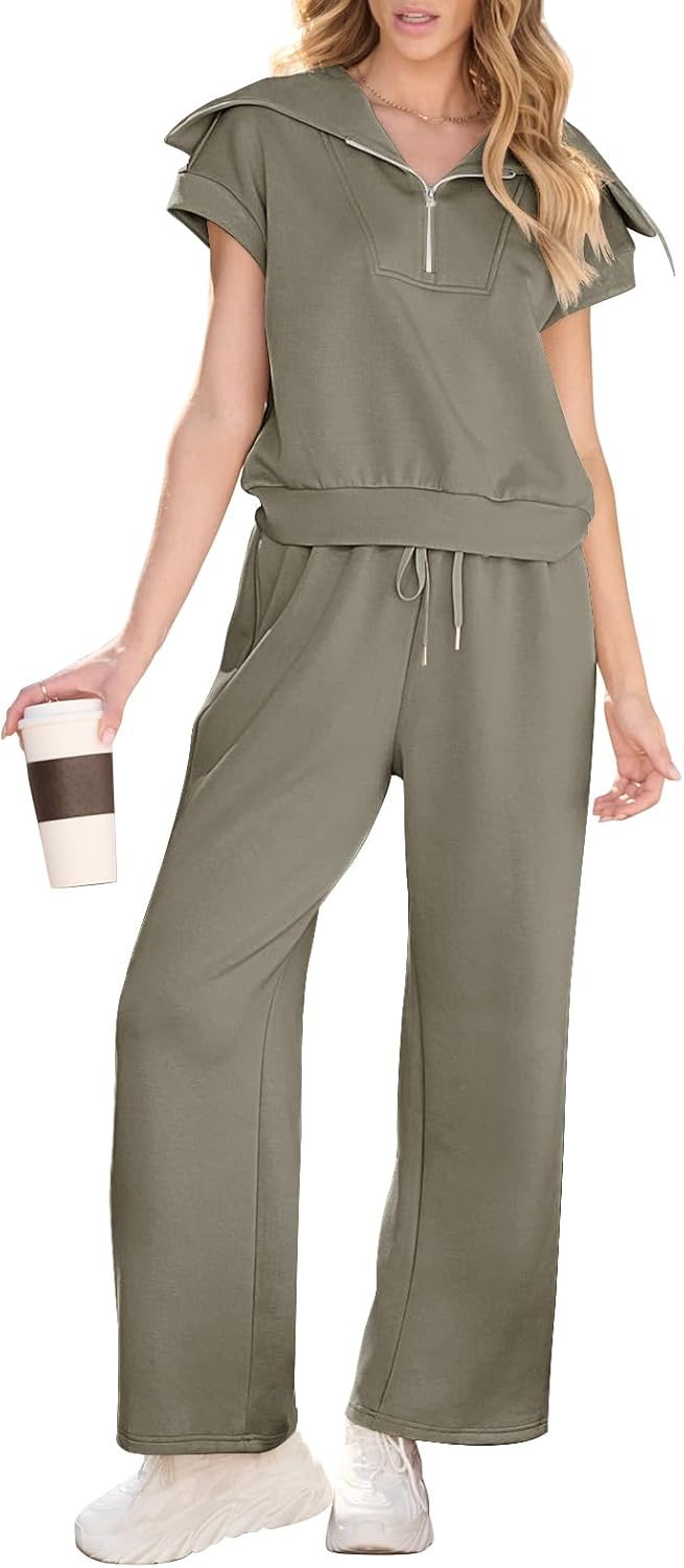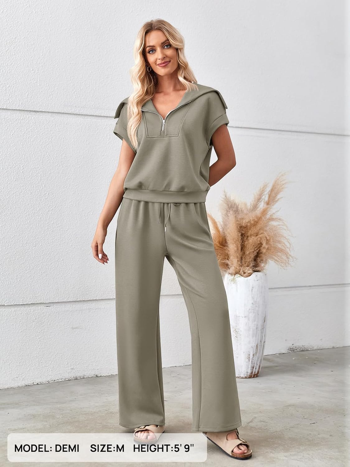 MEROKEETY Women Two Piece Outfits Half Zip Lapel Cap Sleeve Sweatsuit Set