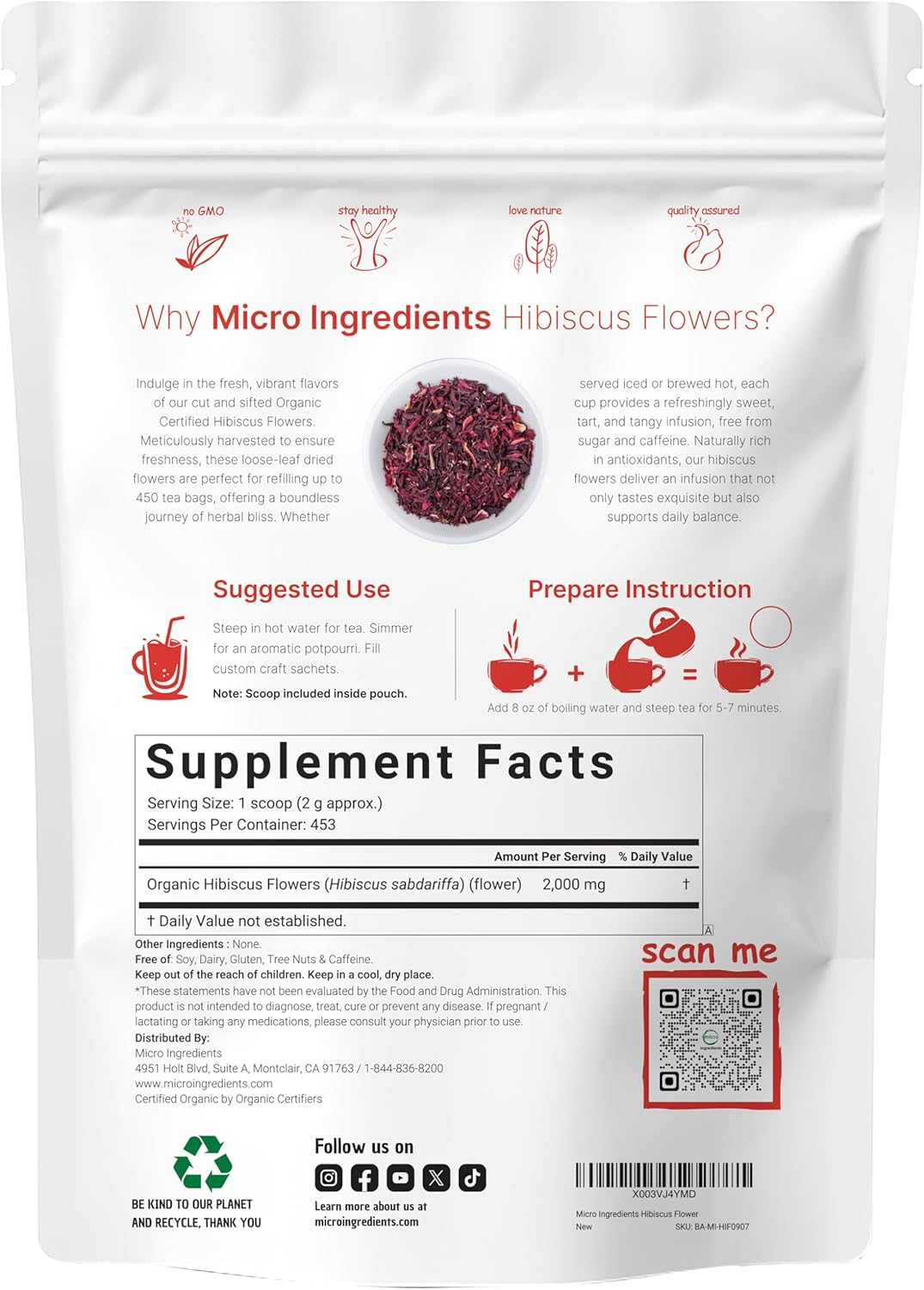 Each pouch contains 2 pounds of dried hibiscus flowers, provides 2g organic hibiscus flowers from hibiscus sabdariffa per serving, bulk 453-day supply.