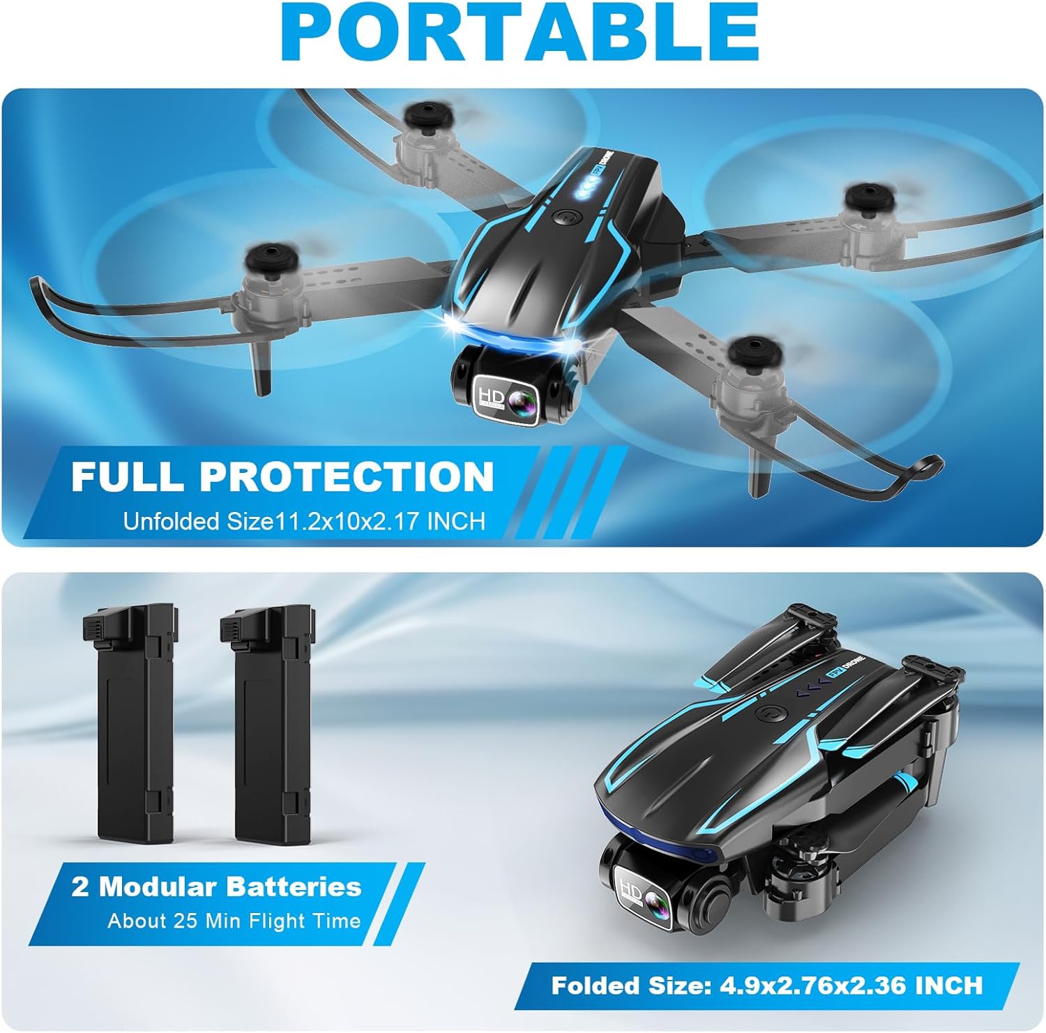 Longer Fly Time & Safe Design: The FPV drone has two rechargeable batteries, providing you with up to 25-30 minutes of flying experience. Note that more flips & faster speeds will reduce the flight time per battery. The drone also comes with collision avoidance equipment and low power alarm to ensure a safe and reliable flight. We recommend your first test flight with the HK66 drone with propeller guards in an open area (Note: there might be wind interference when using outdoors), so you can enjoy maneuvering your drone while ensuring your safety!