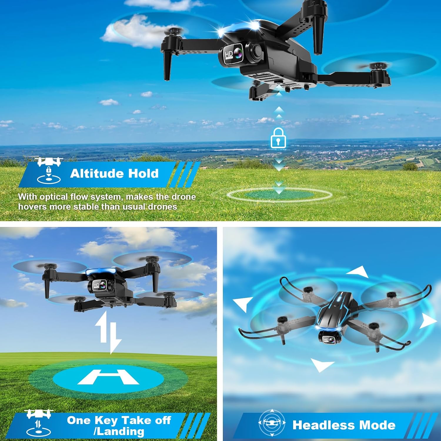 Optical Flow Positioning & More Fun to Fly: The hovering system and optical flow positioning technology ensure a more stable and controllable flight, keeping the drone at a certain height and capturing high-quality photos and videos. One-key takeoff/landing function can help users to start flying easily, the altitude hold feature allows the drone to hover in the air. Especially, Cool light design brings you wonderful flying experiences.