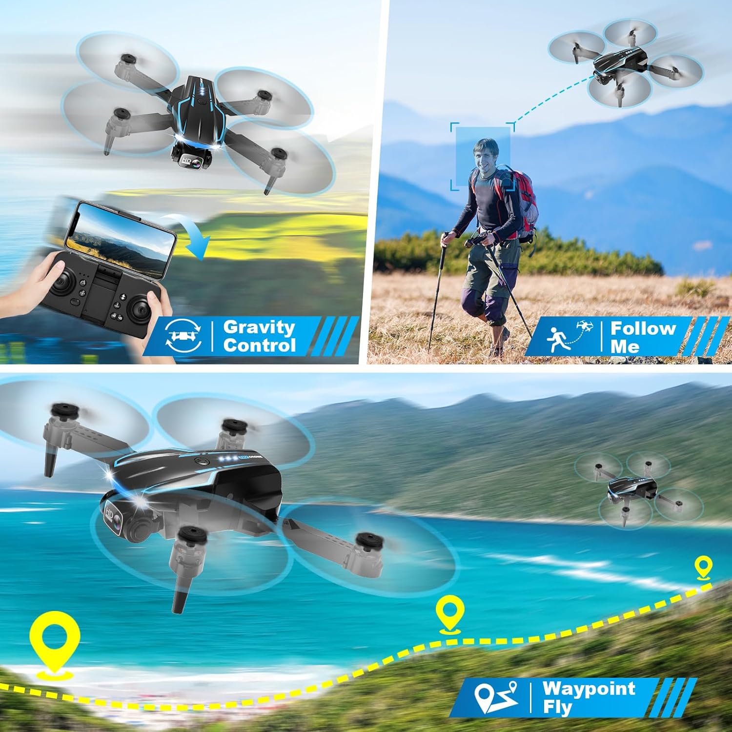 Multiple Functions Fit Your Need: Our Drones come with optical flow positioning, barometric altitude hold, waypoint fly, gesture selfie, 360° flips, auto-follow, gravity control, 3 speeds, headless mode, and one-button takeoff/landing. The operation is easy and fun. Whether you are a beginner or an experienced player, this drone will provide you with a delightful flying adventure experience.