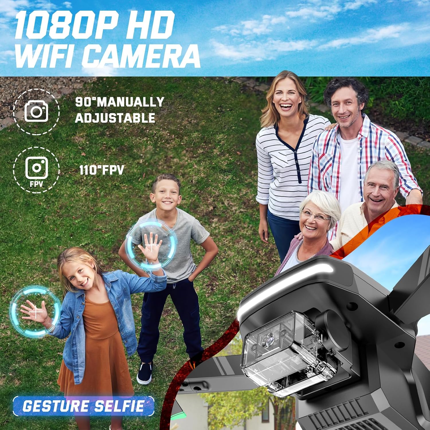 FPV Drone with 1080P HD Camera: Simply connect the WiFi with your phone to enjoy Real-time aerial photos/videos from the drone’s perspective; FPV transmission brings you an immersive RC experience; 90° manually adjustable to down shot the whole scenery