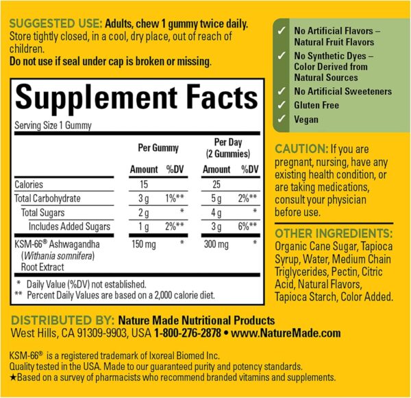 Nature Made Ashwagandha KSM 66 is a stress supplement that helps calm and reduce stress. In clinical studies, participants reported decreased stress in 4 to 8 weeks. Sourced from high quality ingredients, this gluten free Ashwagandha for men and women dietary supplement has no artificial flavors, no synthetic dyes, no artificial sweeteners, and is vegan. These Ashwagandha gummies are made with pectin, not gelatin. These KSM-66 Ashwagandha supplements feature a delicious mixed berry flavor, and these stress supplements also support a healthy stress response. Nature Made Ashwagandha gummies for women and men are gummy vitamins that offer a tasty way to take your Ashwaganda if you don’t prefer to take other forms like capsules. Ashwagandha KSM-66 offers daily support for stress. KSM 66 is produced using a proprietary extraction process and uses the root, the part of the plant traditionally used in Ayurveda. Adaptogens supplements such as Ashwagandha may help the body adapt to and reduce stress. Adults chew one Ashwagandha supplement twice daily. *Based on a survey of pharmacists who recommend branded vitamins and supplements. KSM-66® is a registered trademark of Ixoreal Biomed Inc.