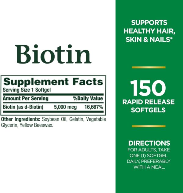 HAIR HEALTH 150-count, 5000mcg Biotin Rapid Release Softgels. Biotin is the most commonly used vitamin for healthy hair.(1) Nature’s Bounty Biotin 5000mcg combines science and innovation to help support and maintain healthy, beautiful hair.(1)