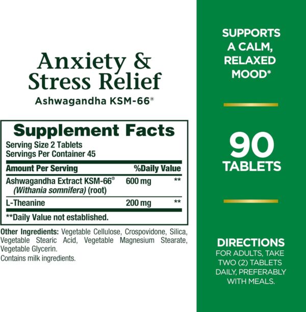 Nature’s Bounty Stress Relief tablets offer support for maintaining a calm state of mind, even during times of occasional stress.(1) Formulated with clinically studied Ashwagandha KSM-66, a popular adaptogenic herb, this herbal supplement helps your body respond to stress.(1) Each serving provides 200 mg of L-Theanine, an amino acid known for its ability to promote relaxation and support a balanced mood.(1) By combining these key ingredients, Nature’s Bounty Stress Relief tablets provide comprehensive support for managing stress and promoting emotional well-being.(1) Incorporate this supplement into your daily routine to experience a sense of calm and resilience in the face of life’s challenges.(1) With Nature’s Bounty Stress Relief tablets, you can take proactive steps toward a balanced and harmonious state of mind.(1) Like all Nature’s Bounty products, our stress relief supplements are backed by 50 years of quality, science, and great ingredients—guaranteed. Each bottle contains 90 tablets.
