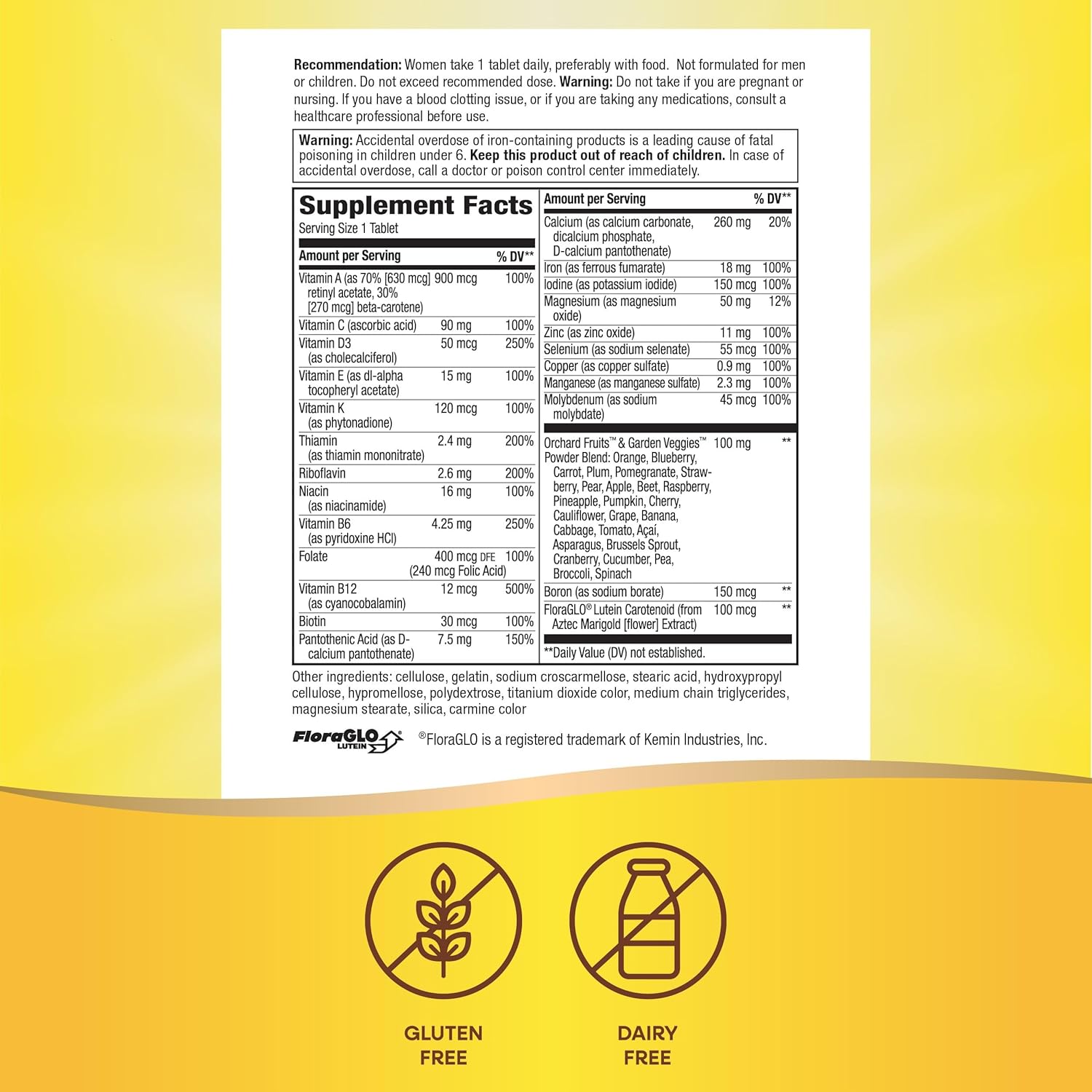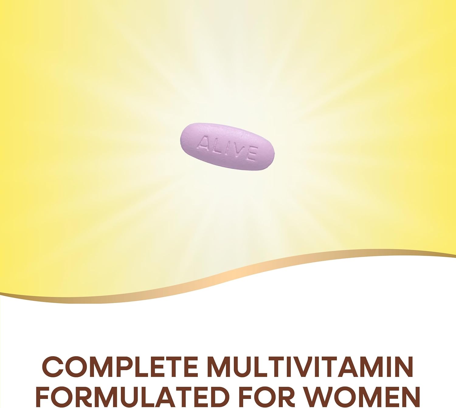 Nature’s Way Alive! Women’s Complete Mulivitamin is a daily multivitamin for women. It supports energy metabolism and healthy hair, skin, and nails.* Formulated with 100% or more Daily Value of 20 essential vitamins and minerals, including iron, vitamin A, and vitamin C. With high potency B-vitamins to help convert food into fuel.* Contains food-based Orchard Fruits & Garden Veggies powder blend (100 mg per serving). *This statement has not been evaluated by the Food and Drug Administration. This product is not intended to diagnose, treat, cure, or prevent any disease.