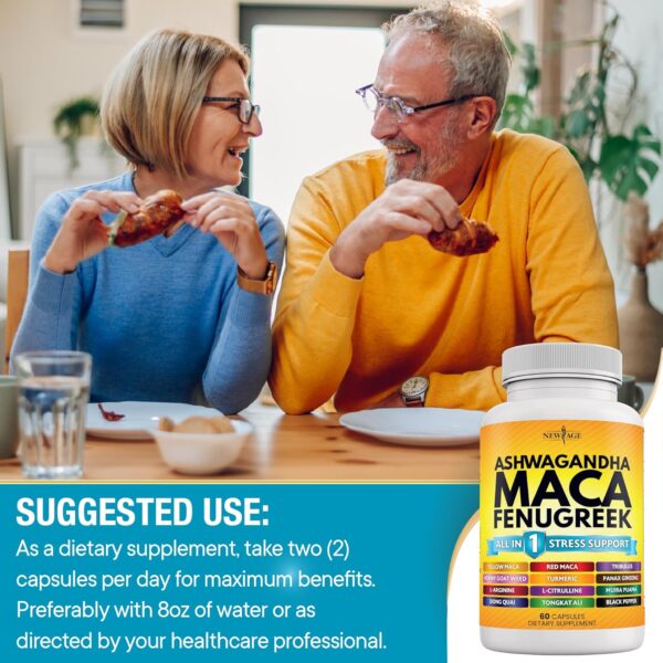 NEW AGE Ashwagandha 5000mg Maca Root 5000mg Fenugreek 3000mg Supplement with Tongkat Ali Ginseng – Assists with Overal Health – Made in USA – 120 Count