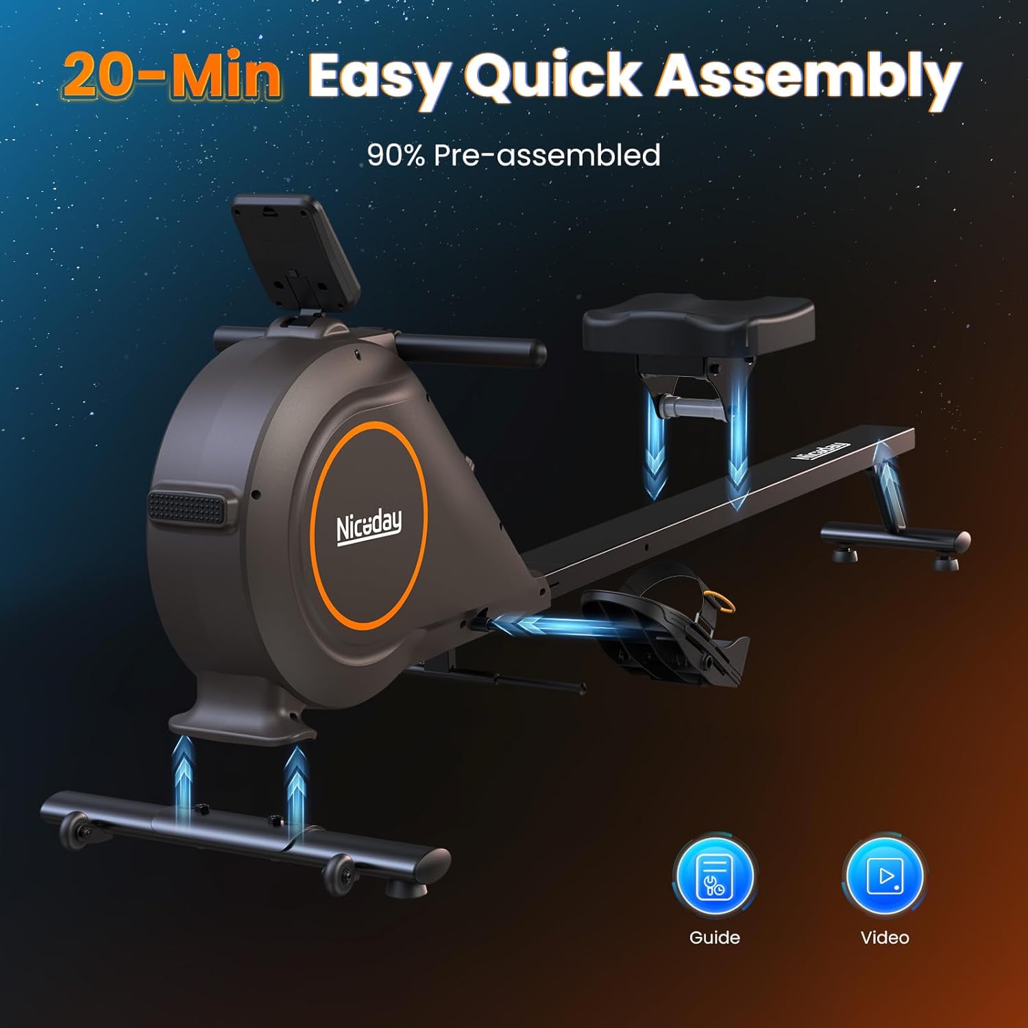 20-Min Quick Assembly: The Niceday Rowing Machine arrives 90% pre-assembled and can be fully set up in just 20 minutes using the instruction manual or installation video via QR code