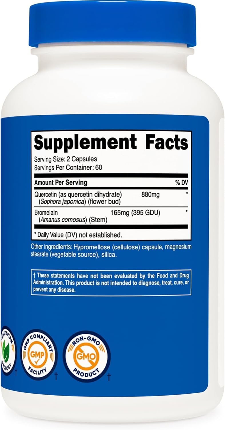 120 or 240 Quercetin Capsules Per Bottle Size Options 60 or 120 Servings of Quercetin Per Bottle 880mg of Potent, High Quality Quercetin Per Serving (440mg Capsules) 165mg of Bromelain Per Serving Vegetarian Capsules. Always over a Year Remaining Before Expiration (See bottom of bottle) Made in a GMP Compliant Facility