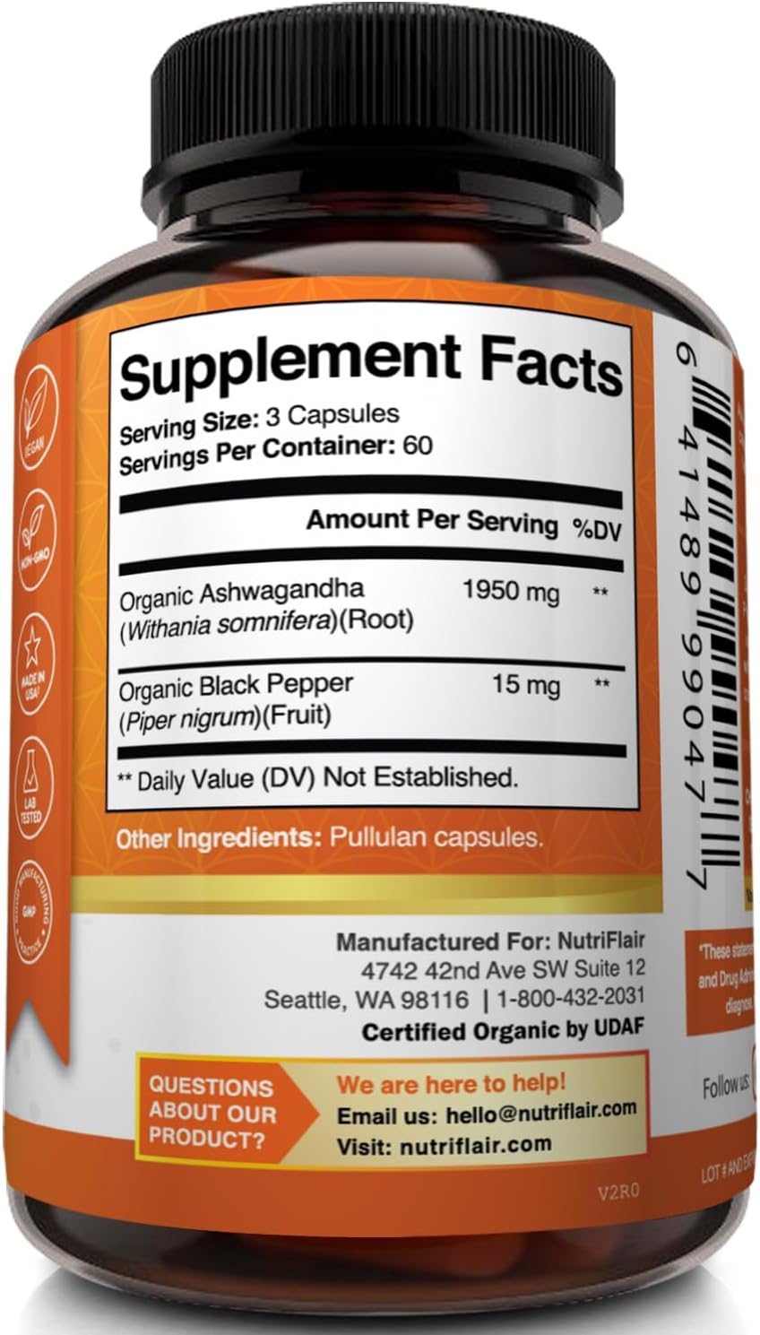 Enhanced Absorption with Organic Black Pepper: Contains 15mg of organic black pepper per serving to enhance the absorption and effectiveness of Ashwagandha, ensuring you get the most out of each capsule.