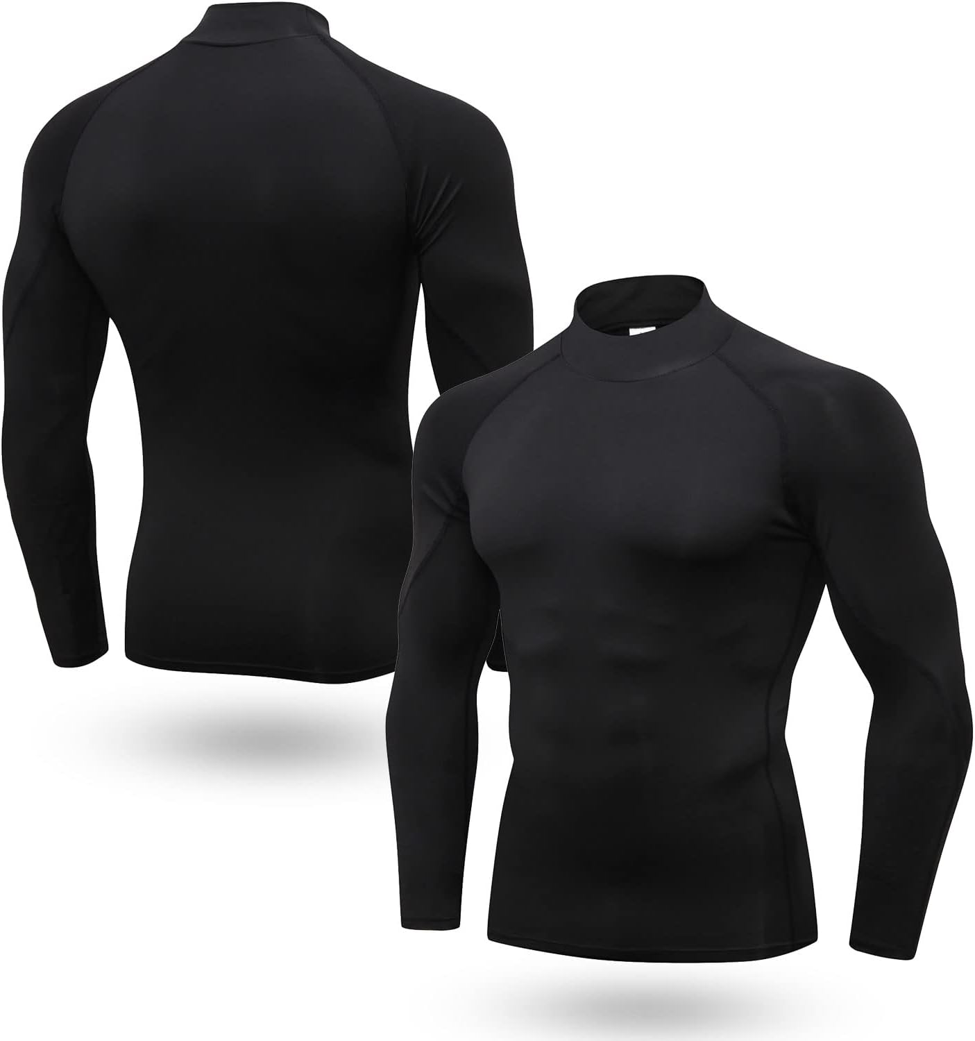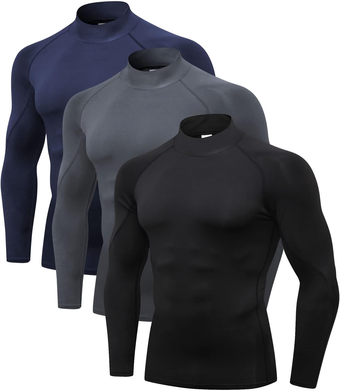 Odoland Mens 3 Pack Long Sleeve Compression Shirts, Athletic Mock Turtleneck Shirts, Active Workout Cool Dry Base Layer Top