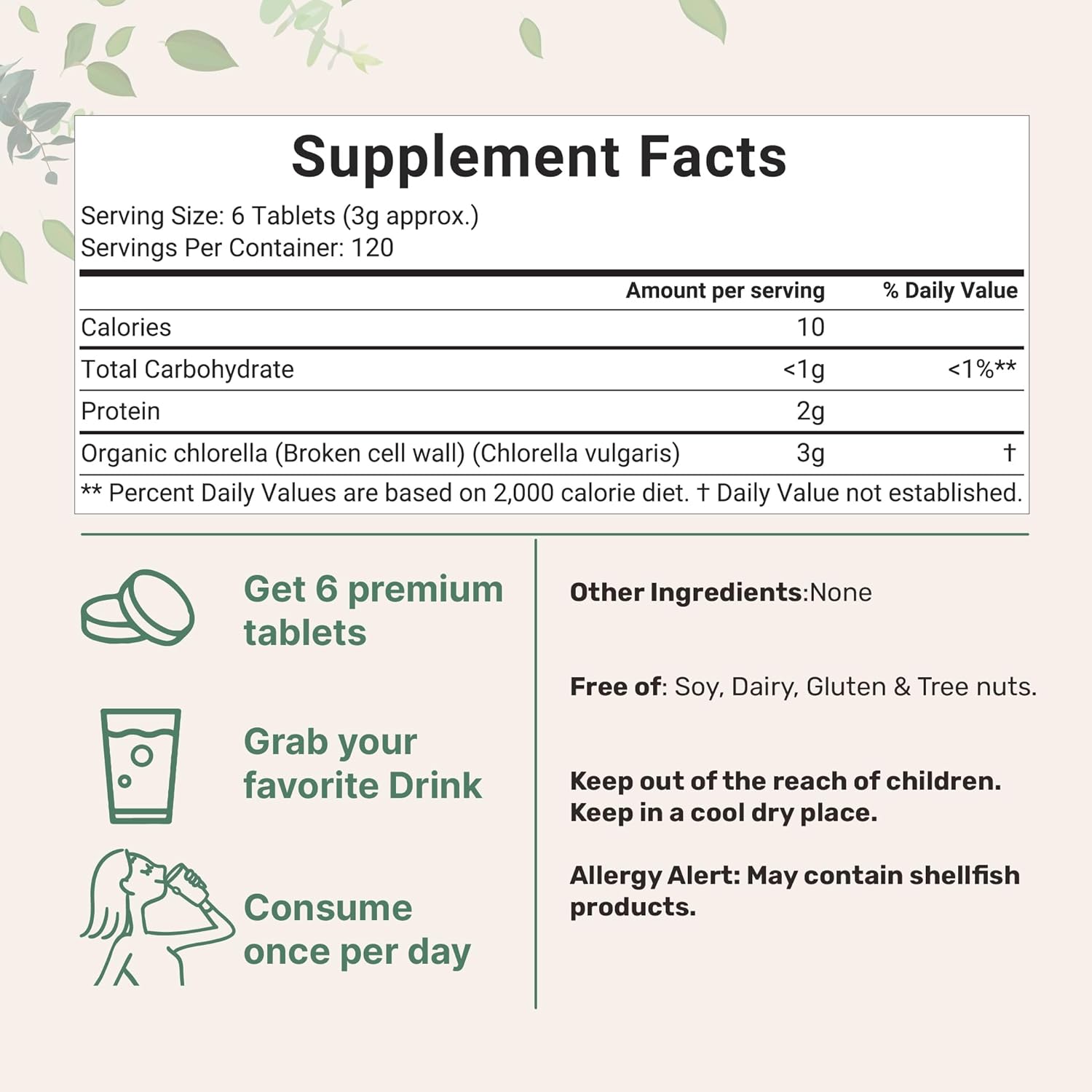 Organic Non-GMO chlorella tablets that are made without additives, fillers, preservatives, artificial colors or flavors, soy, or gluten. All ingredients must pass our 3rd party lab tests to ensure a product that is safe, pure, and potent.