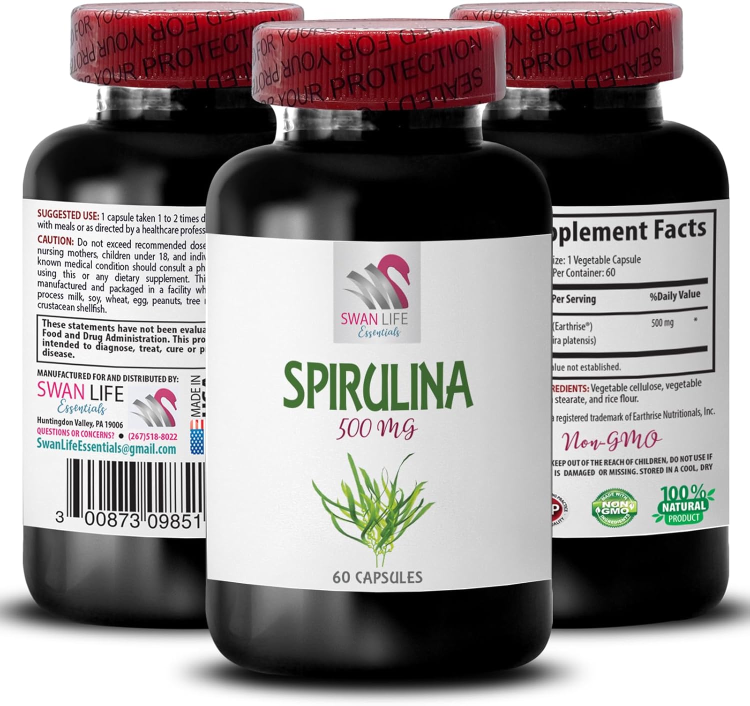organic immune support supplement – spirulina blue – SPIRUILINA 500MG – spirulina tablets – spirulina and chlorella powder organic, spirulina for memory, energy bits spirulina chlorella – 1 Bottle Spirulina is rich in a range of vitamins and minerals essential for maintaining a healthy immune system, like vitamins E, C, and B6. Research finds that spirulina also boosts your immune system, is a powerful antioxidant. Spirulina is a potent source of nutrients. It contains a powerful plant-based protein called phycocyanin. Research shows this may have antioxidant and brain-support properties. Plus, the quality of the protein in spirulina is considered excellent and provides all of the essential-amino acids that your body needs. Spirulina can boost the overall health and radiant appearance of your skin, as well as preventing skin swelling. Rich in nutrients, vitamins and both fatty and amino acids, Spirulina improves skin and encourages cell turnover to promote a more youthful-looking complexion.. Spirulina is a fantastic source of antioxidants, which can protect against oxidative damage. Its main active component is called phycocyanin. This antioxidant substance also gives spirulina its unique blue-green color. Primarily, spirulina boasts antioxi-dants, like phycocyanin and beta-carotene, that effectively counter oxidative stress. Spirulina also provides a small amount of fat including both omega-6 and omega-3 fatty acids in an approximately 1.5 to 1 ratio. Spirulina has omega-3 and omega-6 fatty acids in the form of ALA, EPA, and DHA, making it a powerful food to aid in promoting healthy cells, and keeping our skin beautiful. It also contains magnesium, potassium, and manganese. Spirulina microalgae contain a plethora of nutrients providing brain function benefits. Numerous in vivo evidence has provided support for the brain function. Animal-based studies have revealed that introducing spirulina can bolster spatial learning and memory, as well as guard against learning decline linked to aging. Spirulina can promote hair growth, as well as hair and scalp health. Spirulina is packed with protein and contains iron and zinc, essential for strong healthy hair. It adds volume. It’s a great source of all eight essential amino acids as well as 10 of the 12 non-essential amino acids that form the building blocks of your hair’s structure. It may help to prevent hair loss. Spirulina may provide multiple exercise benefits, including enhanced endurance and increased muscle strength. In another study, spirulina supplementation was able to improve oxygen uptake during an arm cycling exercise, with researchers noting that it could act as an ergogenic aid to people who are promoting a healthy lifestyle.