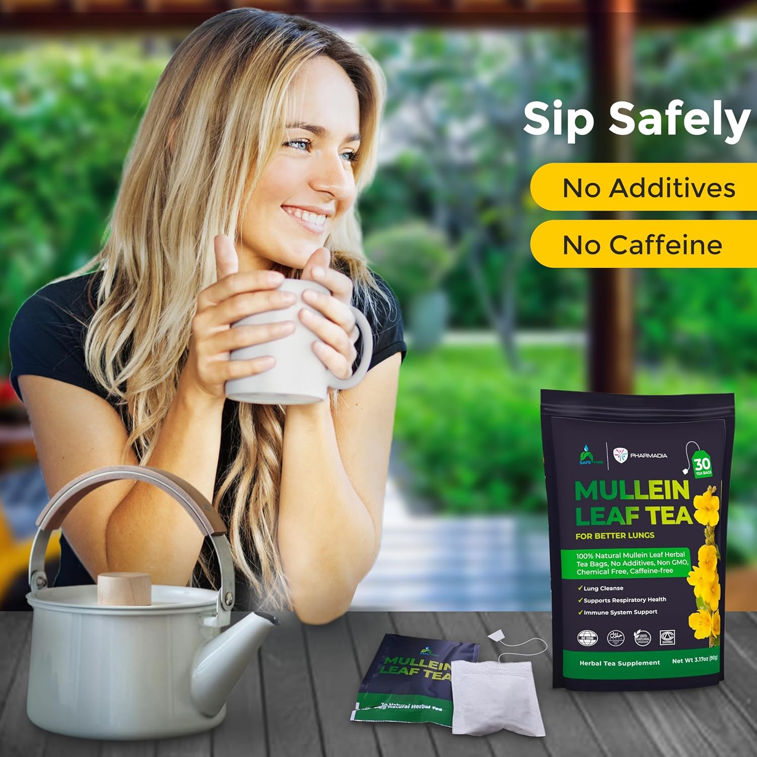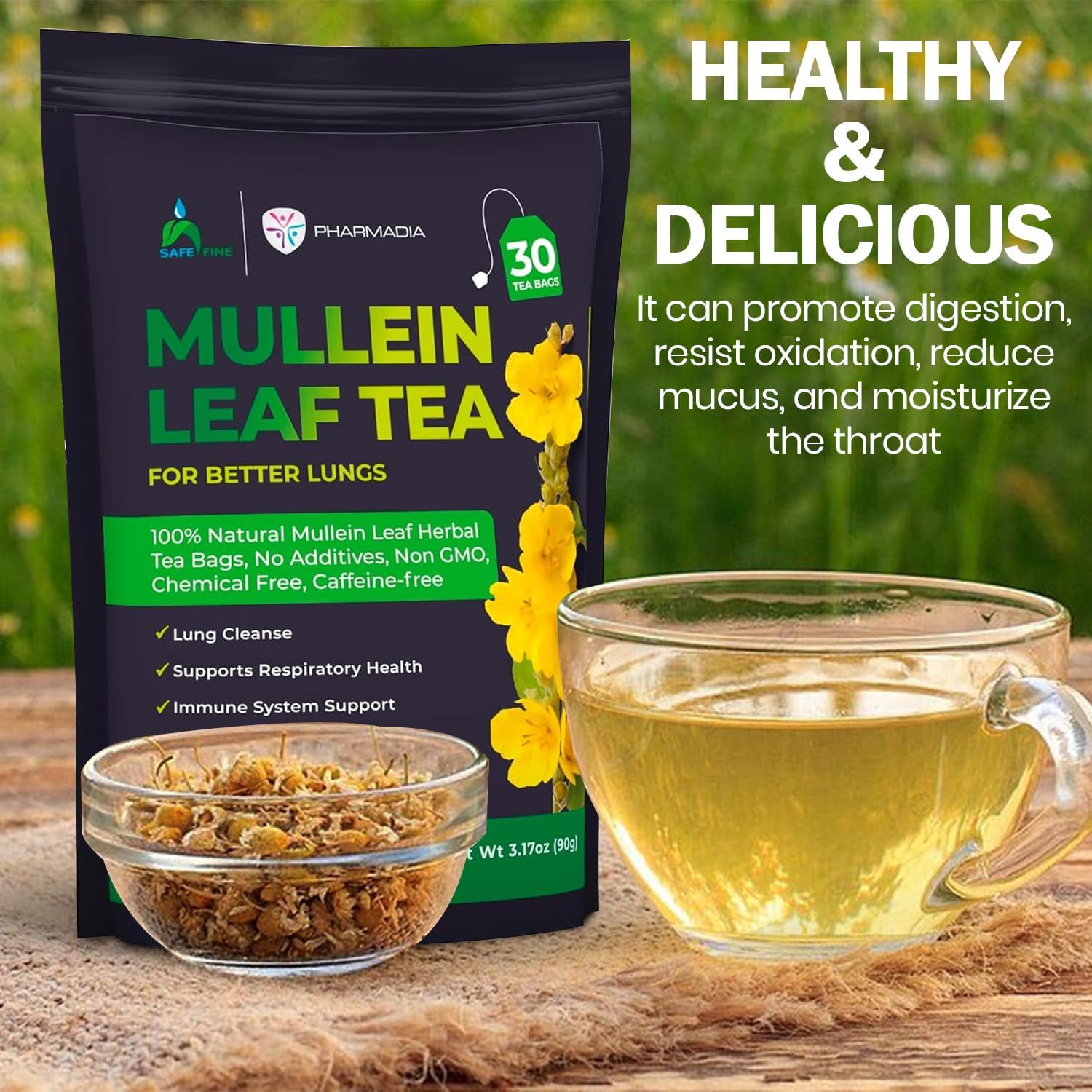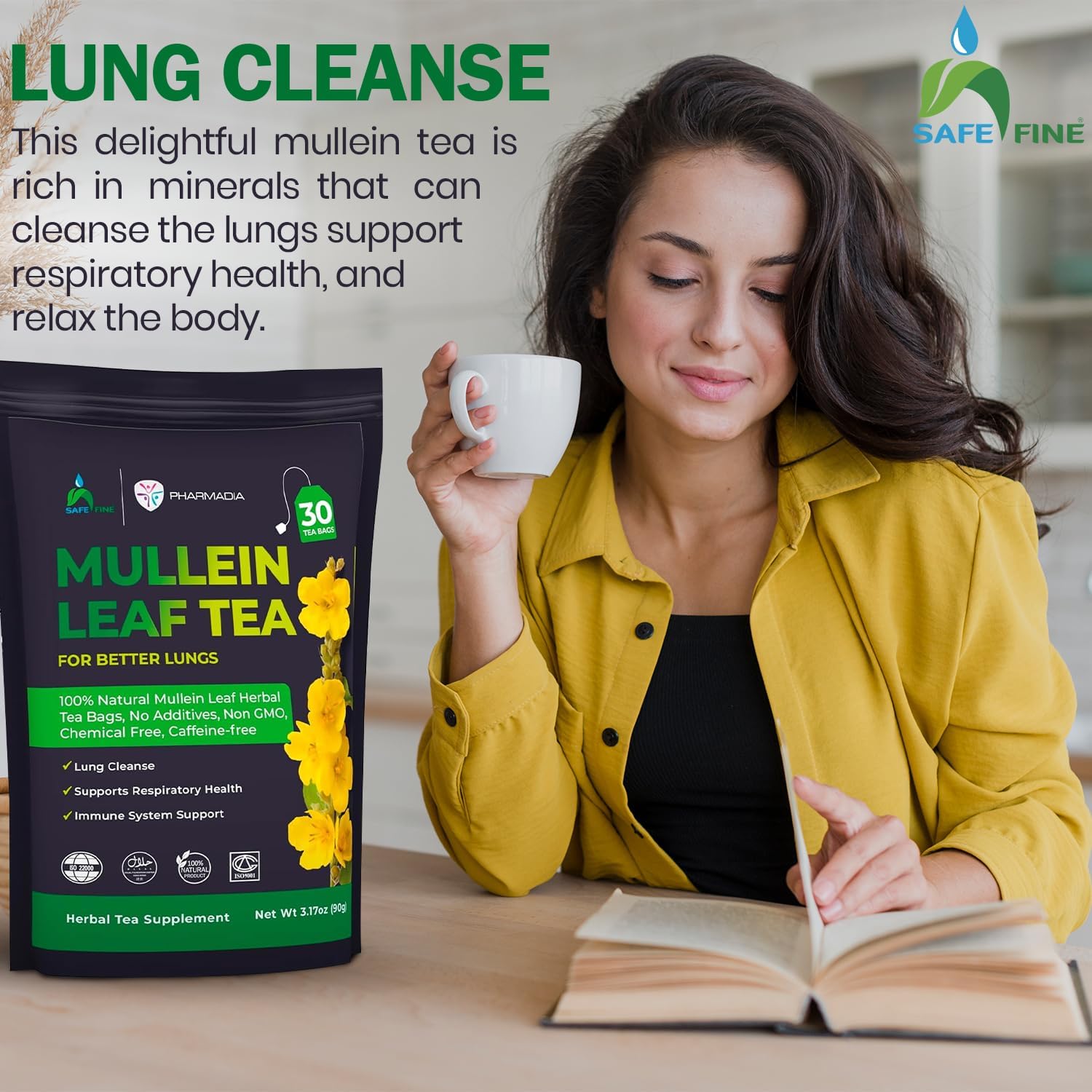 Safefine Mullein Leaf Tea offers 30 organic mullein tea bags for lungs, specially crafted to cleanse lungs naturally.