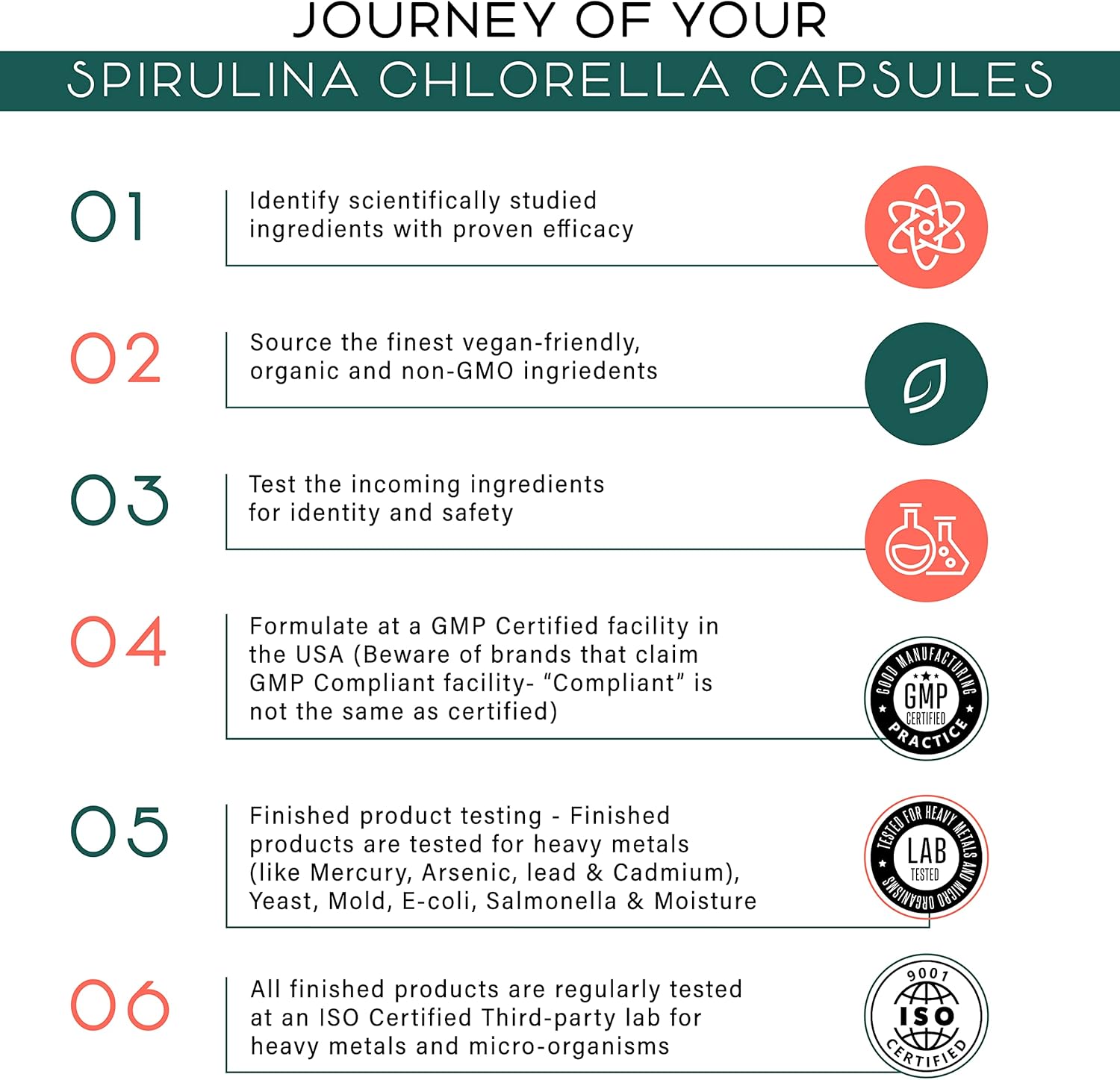 SPIRULINA AND CHLORELLA BENEFIT US IN DIFFERENT WAYS: Unlike stand-alone Spirulina capsules or Chlorella capsules, our vegan-friendly Spirulina Chlorella chlorophyll capsules offer the best of both green superfoods in a 50:50 proportion, including supporting a powerful detox, more energy, and a healthy immune system.