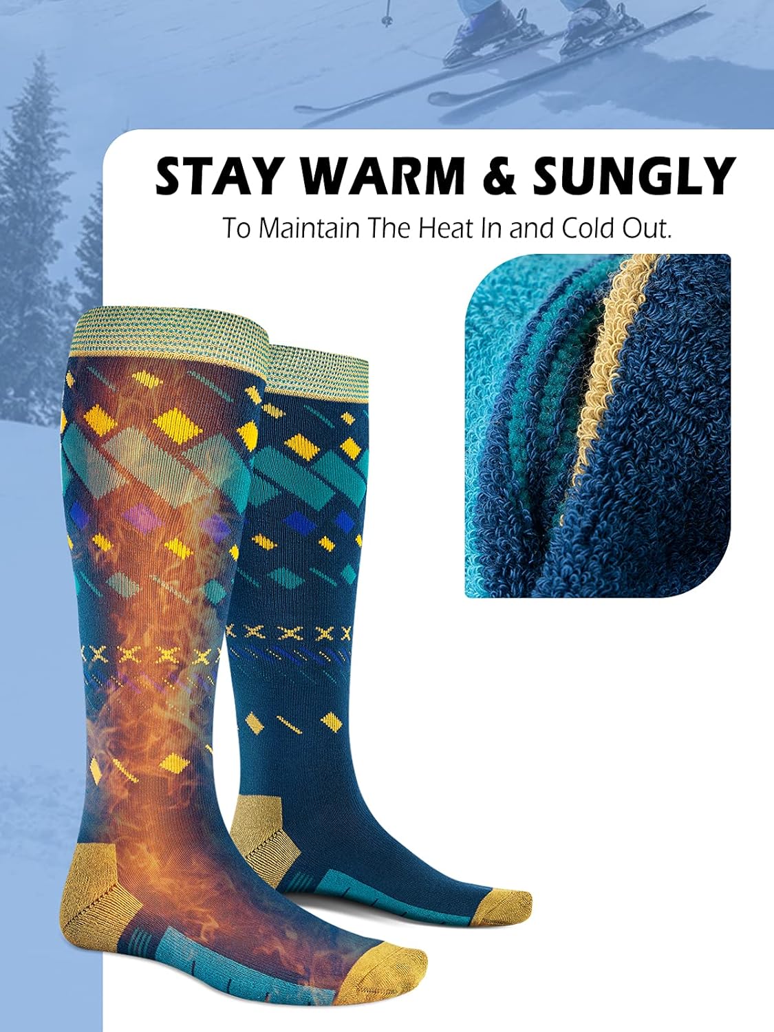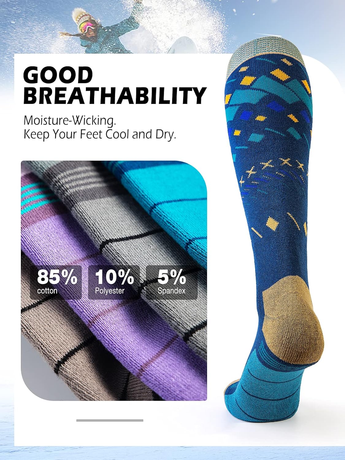 BREATHABLE, WARM & COMFORTABLE – Made of premium Cotton (85% cotton, 10% polyester, 5% spandex), the ski socks are LIGHTWEIGHT, BREATHABLE and PREVENTS build-up of SMELL. It can also keeps foot dry due to the moisture wicking properties. Never need to worry about cold toes while skiing or snowboarding.