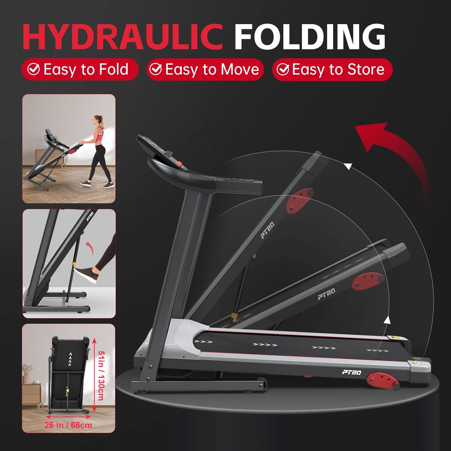 【Comapct & Transportation Wheels】-The portable treadmill can be moved from room to room with transportation wheels. Its hydraulic rod folding mechanism design makes the fitness equipment easy to store