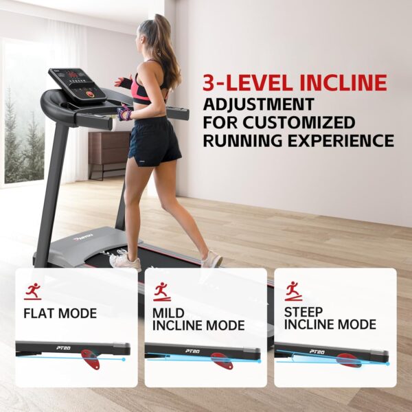 【3-Level Adjustable Incline】- This treadmill offers 3 levels of manual incline can simulate an outdoor running environment by adjusting the incline angle of the treadmill,and you can enjoy walking, jogging, and running and achieve your fitness goal,accelerating fat burning and giving you a better workout experience