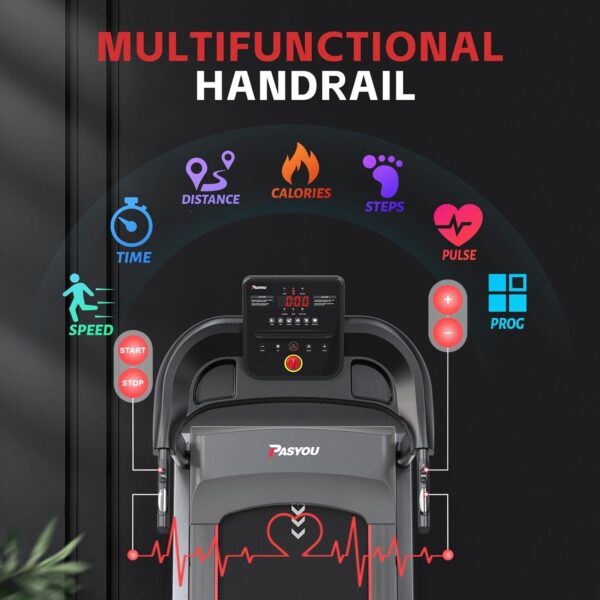 【2.0HP Motor, 265 lbs Capacity, 0.6-7.5 MPH Speed】- The PASYOU Treadmill’s powerful motor supports weights up to 265 pounds and speeds from 0.6 to 7.5 MPH.It provides sustained, efficient power, making workouts smooth and effective