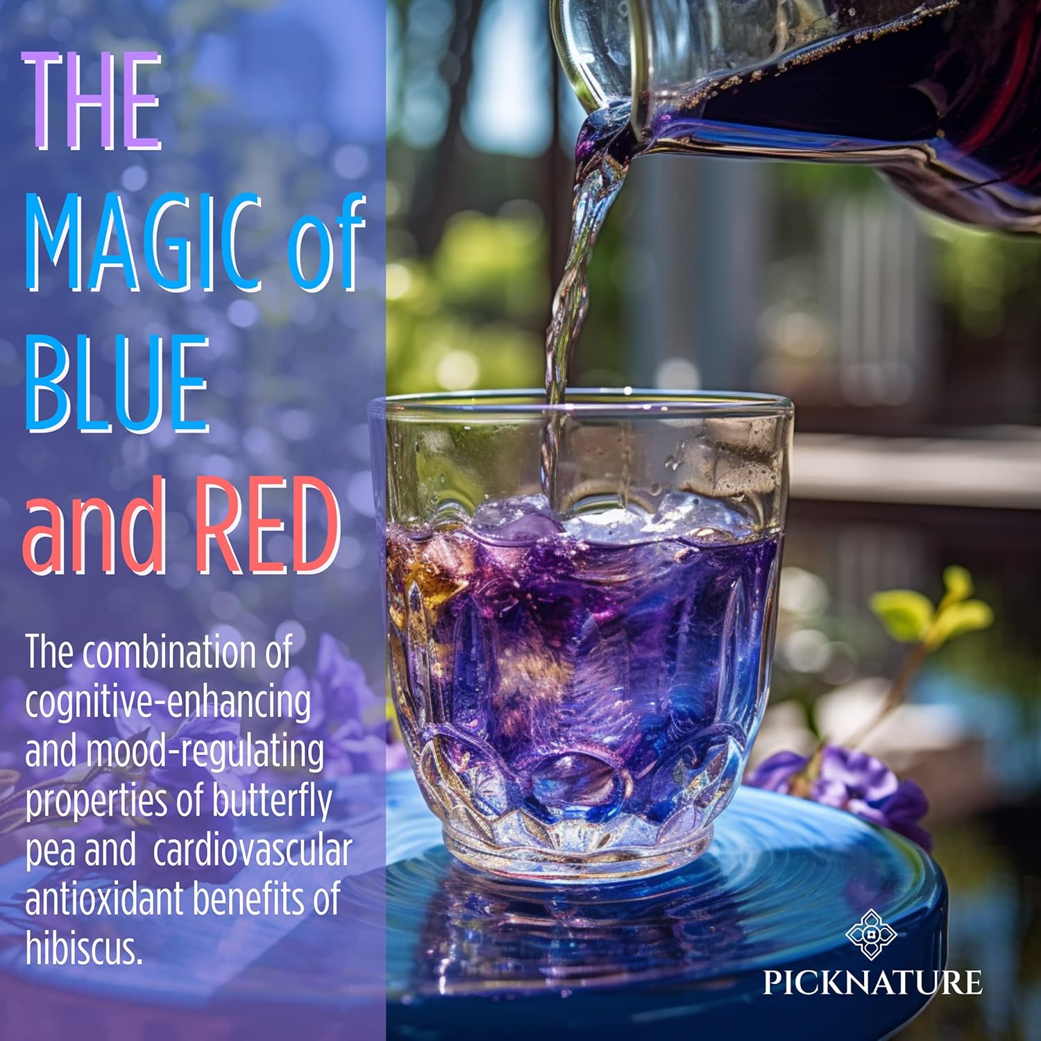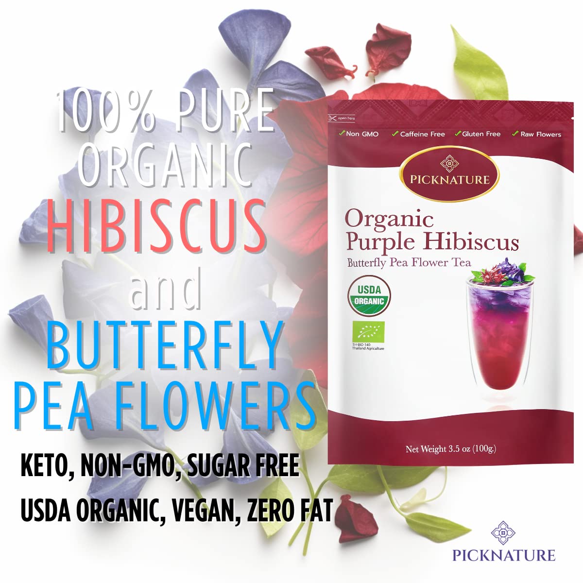 Pure Hibiscus and Butterfly Pea Flower Tea in Loose Leaf form. At Picknature, we take pride in only having products that are organic, non-GMO, and promote a healthy, active lifestyle.