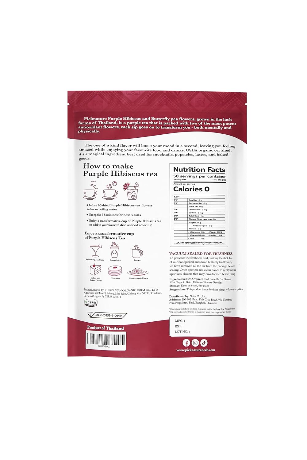 Premium Organic Tea – Picknature Butterfly Pea Flower tea is organic by CERES Laboratory and sustainably sourced from our partnered organic farmers in Thailand. Our product is made with only Non-GMO herbal flowers straight to the bag and nothing else!