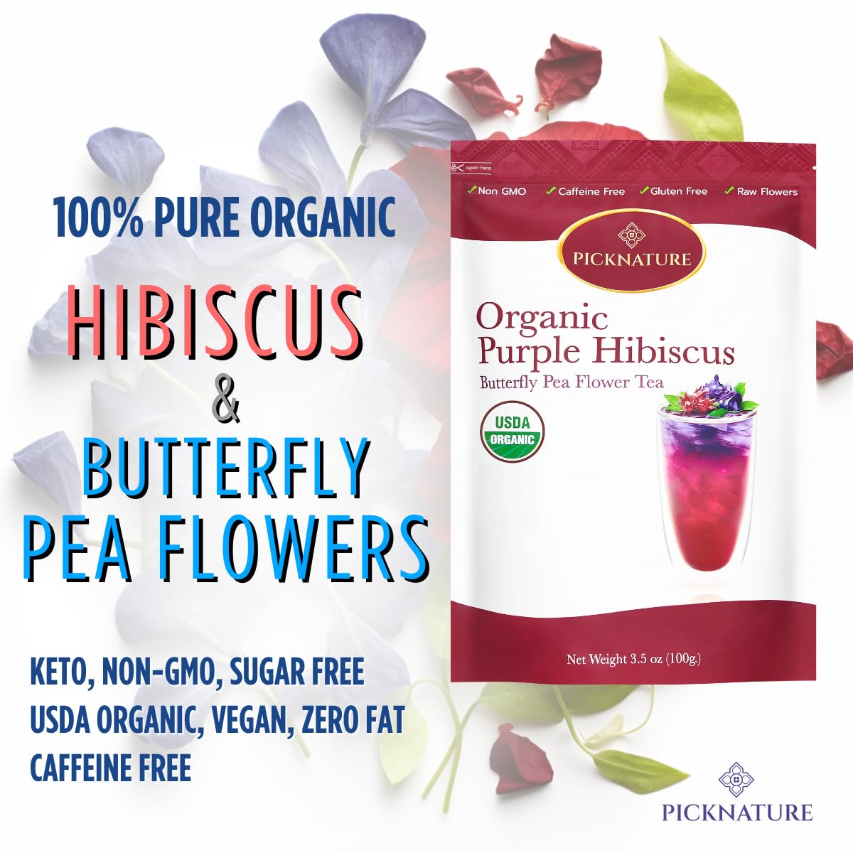 Pure Hibiscus and Butterfly Pea Flower Tea in Loose Leaf form. At Picknature, we take pride in only having products that are organic, non-GMO, and promote a healthy, active lifestyle.