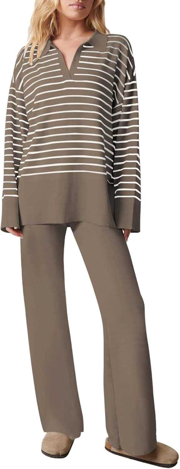 Pink Queen 2024 Fall Sweater Sets for Women 2 Piece Long Sleeve Collar V Neck Sweatsuit Knitted Stripe Pajamas