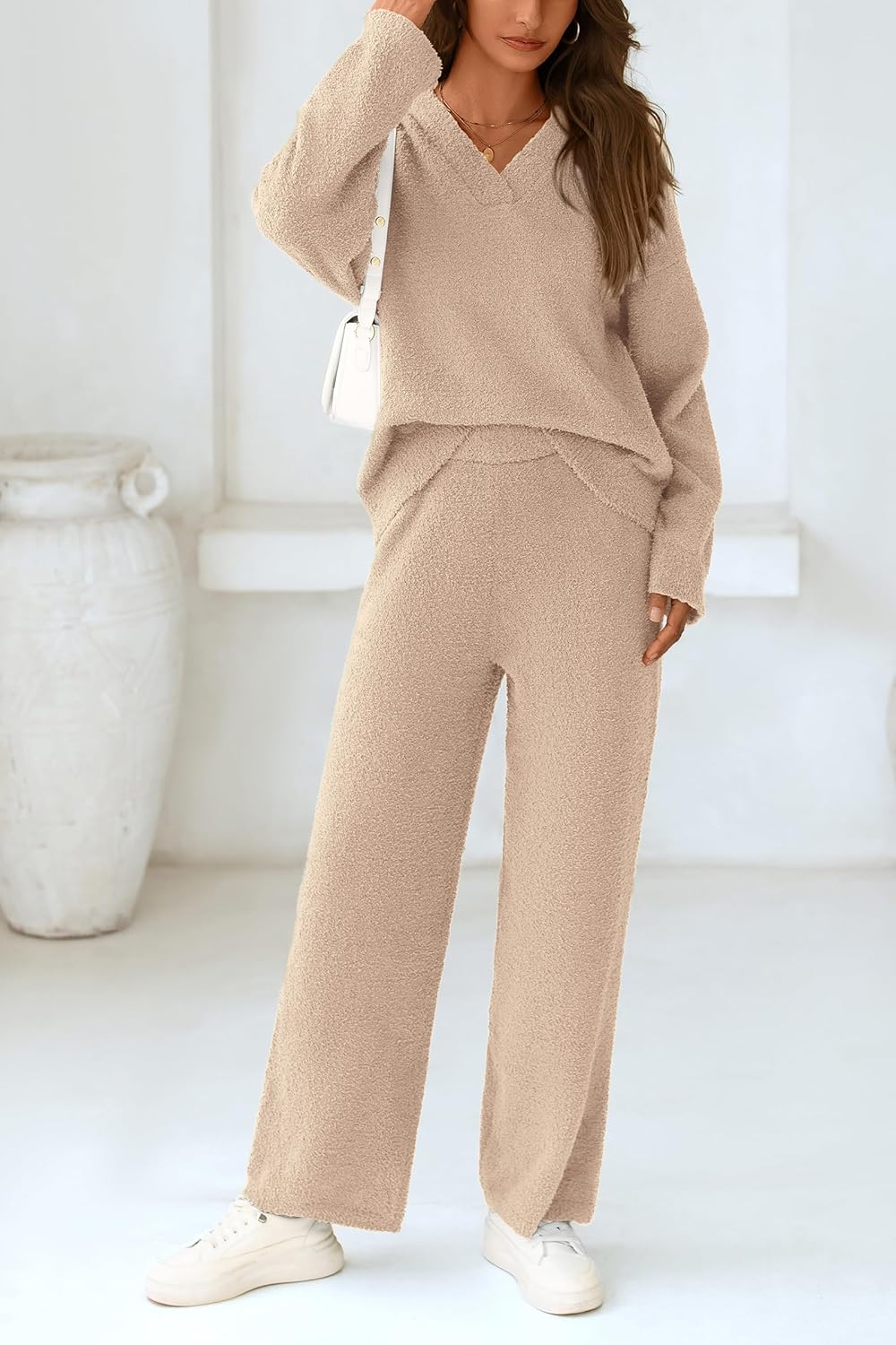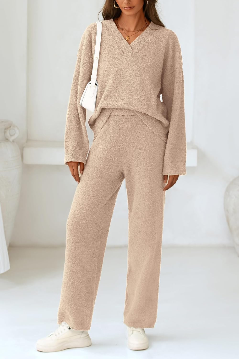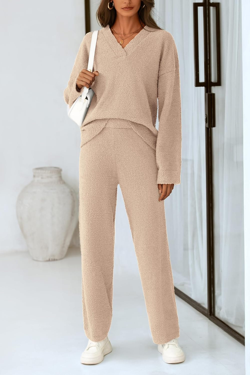 PRETTYGARDEN Womens V Neck Sweater Tops and Elastic Waist Sweatpants Set