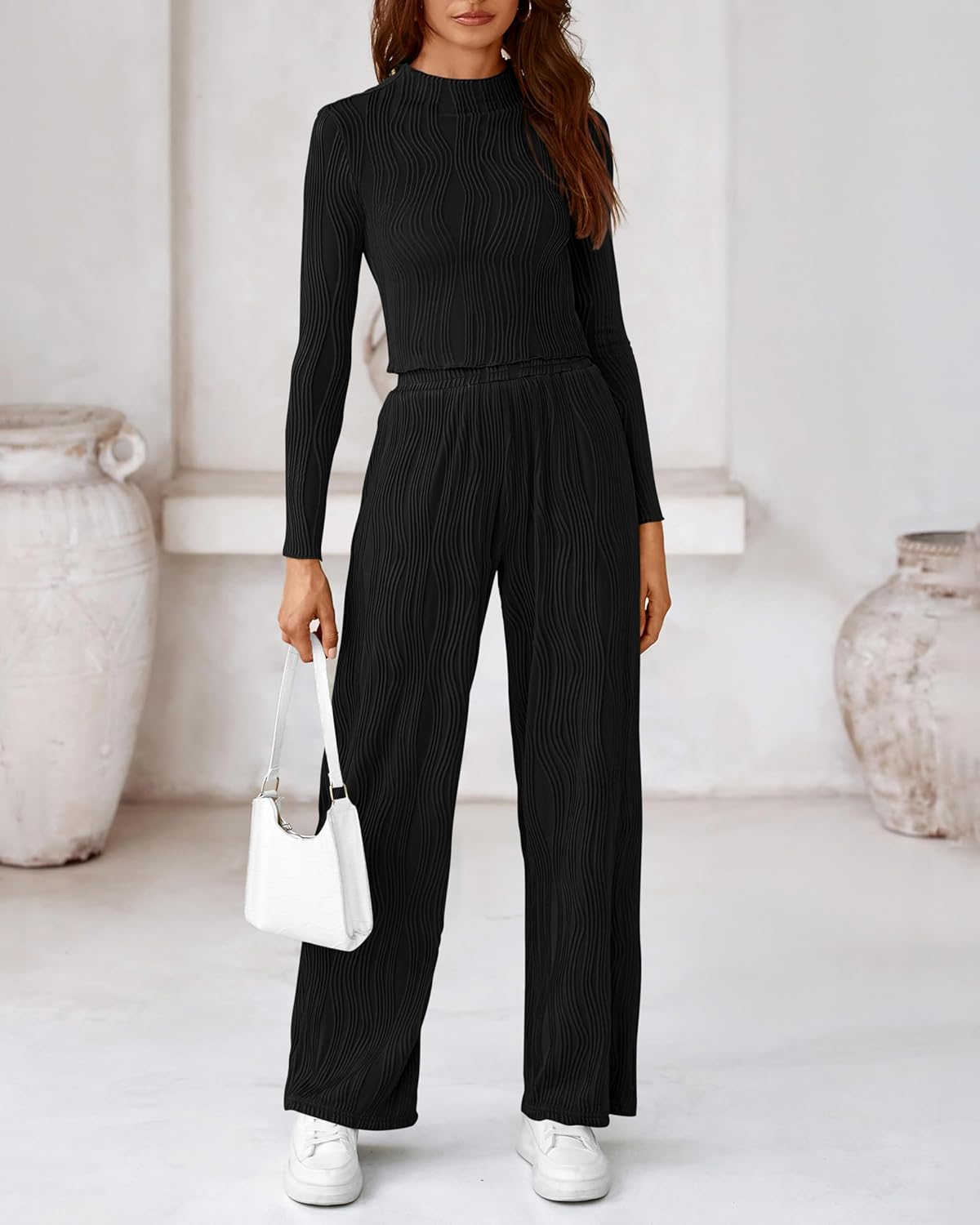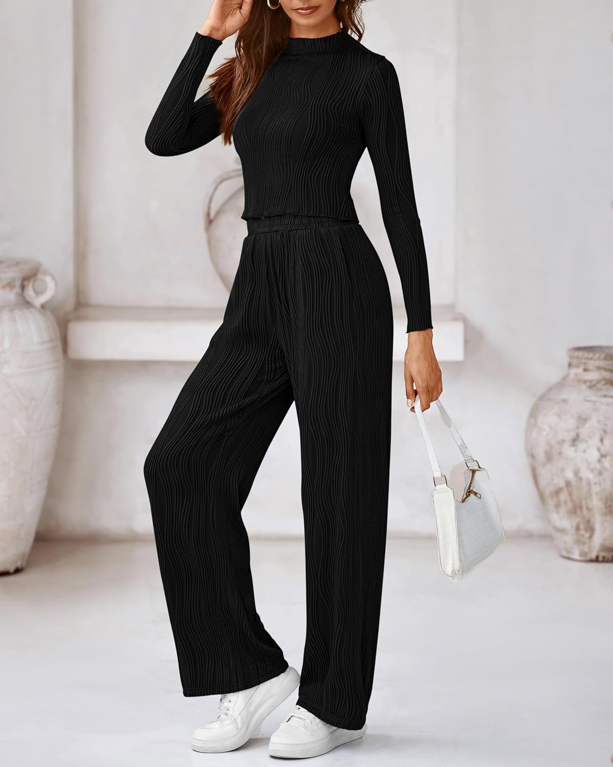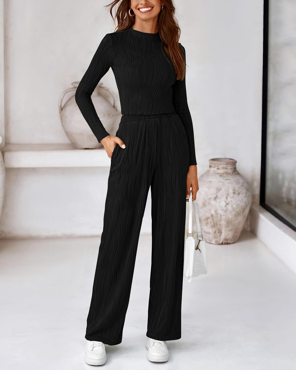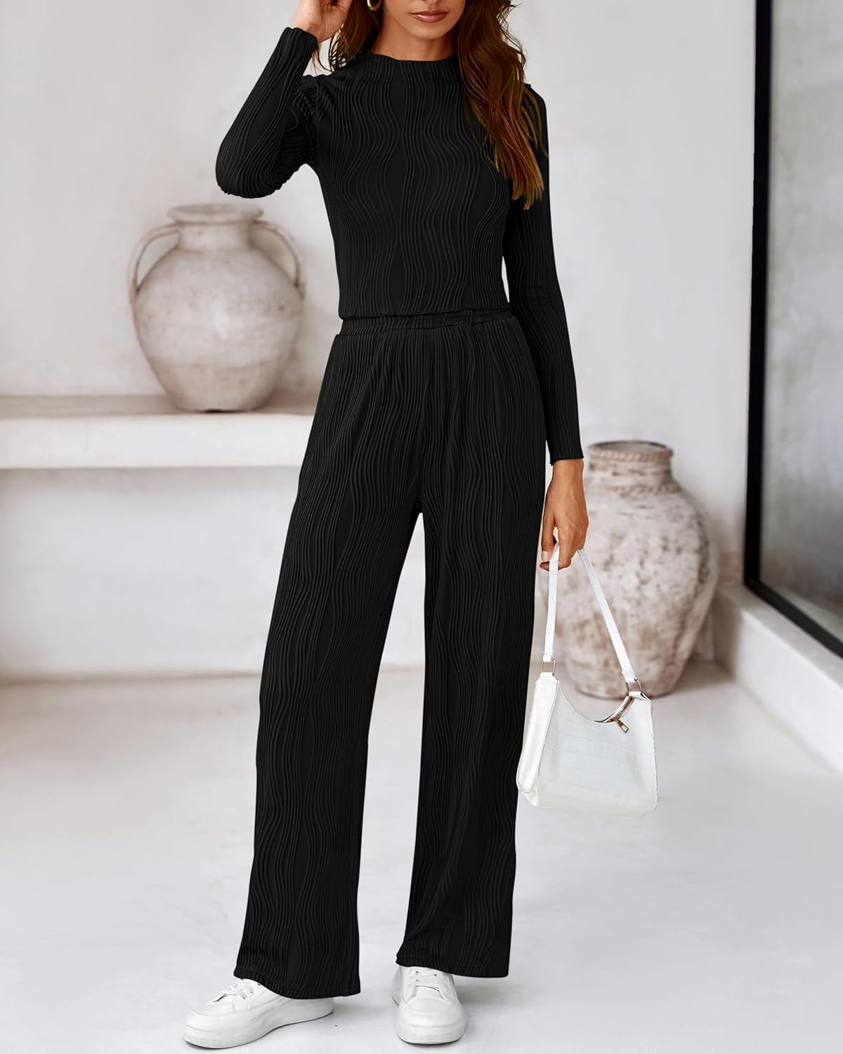 Sexy Y2K Crop Tops—Long Sleeve+Crewneck+Short Length+Textured Fabric Flowy Wide Leg Pants—Elastic High Waist+Two Side Pockets+Loose Fit Cutting+Full Length