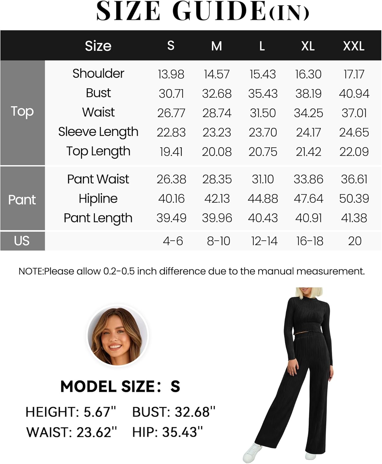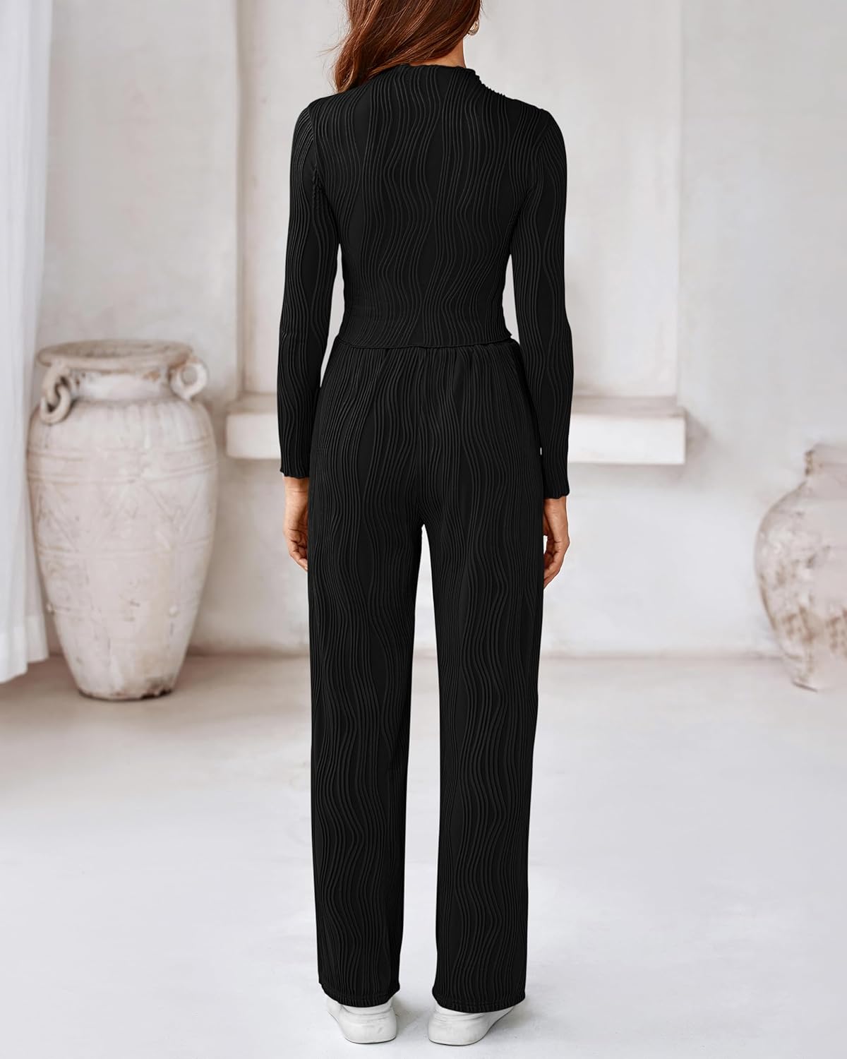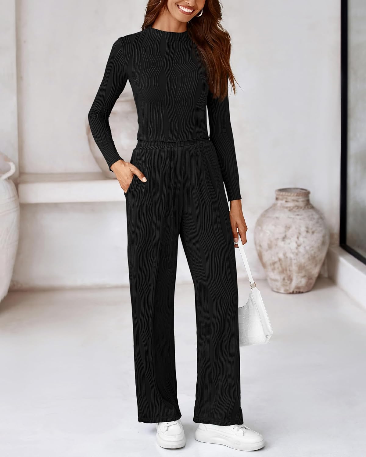 Features:Round Neck Tops / Long Sleeve Crop Top / Slim Fit Textured Tee Shirts / Loose Fit Wide Leg Pants With Two Side Pockets / Flowy Pant Sets 2 Piece / Elastic High Waist Wide Leg pant / Trendy Palazzo Pants Set