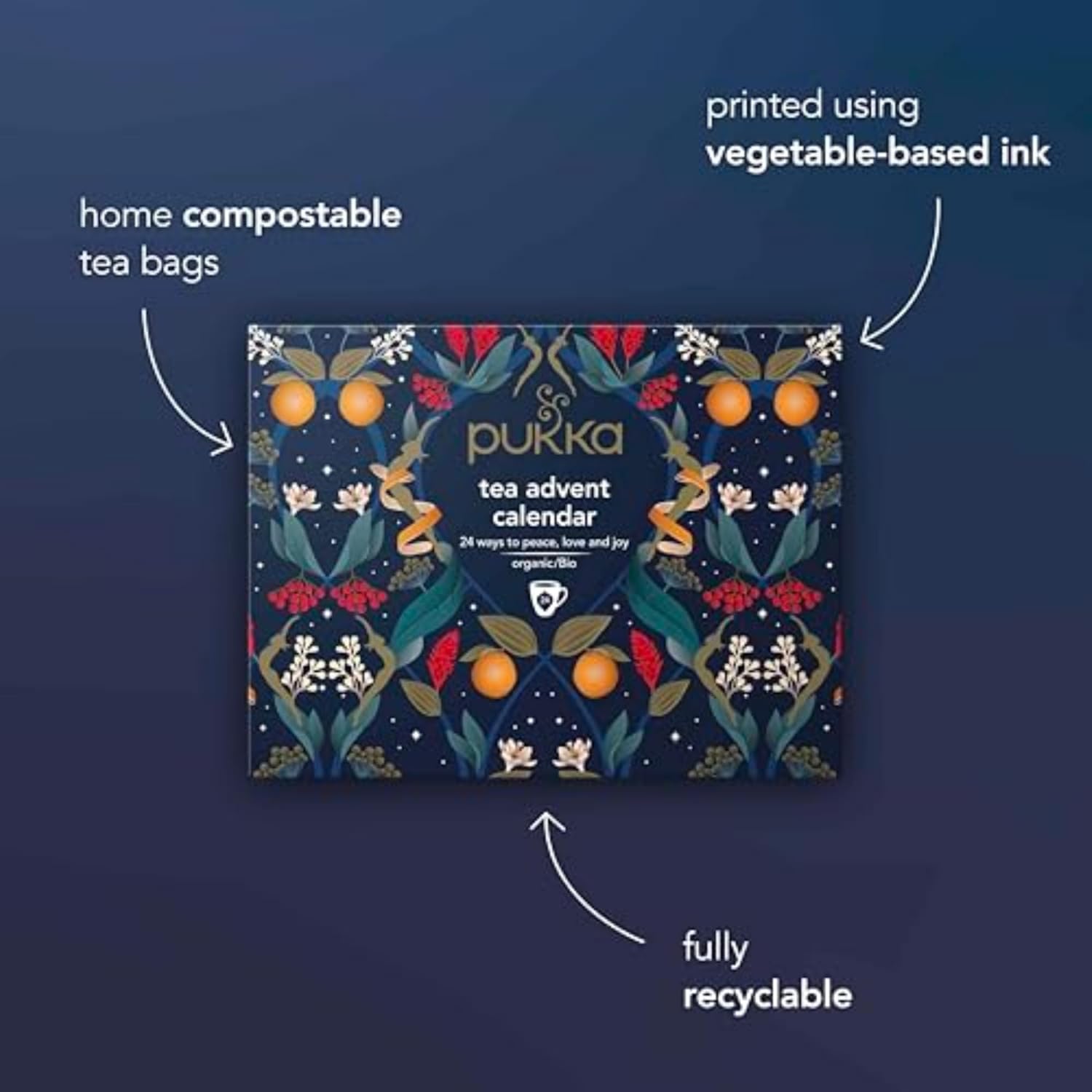 Treat yourself or someone you love this holiday season and unwrap a delicious daily surprise with the Pukka Tea Advent Calendar. Discover a fusion of flavours in every cup, including the festive essence of cinnamon, zesty orange, sweet elderberry and more. Featuring 24 tea sachets, each day brings a new, mouth-watering blend to enjoy as you countdown to Christmas. The Pukka Tea Advent Calendar contains unique blends created by herbalists and based on the health-promoting philosophy of Ayurvedic wisdom, each made with the finest organic herbs sustainably and ethically sourced from around the world. Our blends include favourites like Pukka Three Ginger; Winter Warmer; Night Time; Chamomile, Vanilla & Manuka Honey; Wild Apple & Cinnamon and Supreme Matcha Green. Designed to bring a daily dose of joy and warmth to your heart, this unique selection is perfect for devoted tea lovers looking for an alternative to chocolate. This beautifully crafted advent calendar is also fully recyclable, right down to the organic cotton string on our home-compostable tea bags. Pukka means ‘real, authentic or genuine’ in Hindi, reflecting our commitment to quality since 2001. We use 100% organic, ethically sourced herbs to create high-quality blends with delicious flavours in every cup. Relish the deliciousness of herbal goodness by pouring boiling water over your Pukka tea bag. Leave it to infuse for 3–5 minutes before enjoying your delicious hot tea.