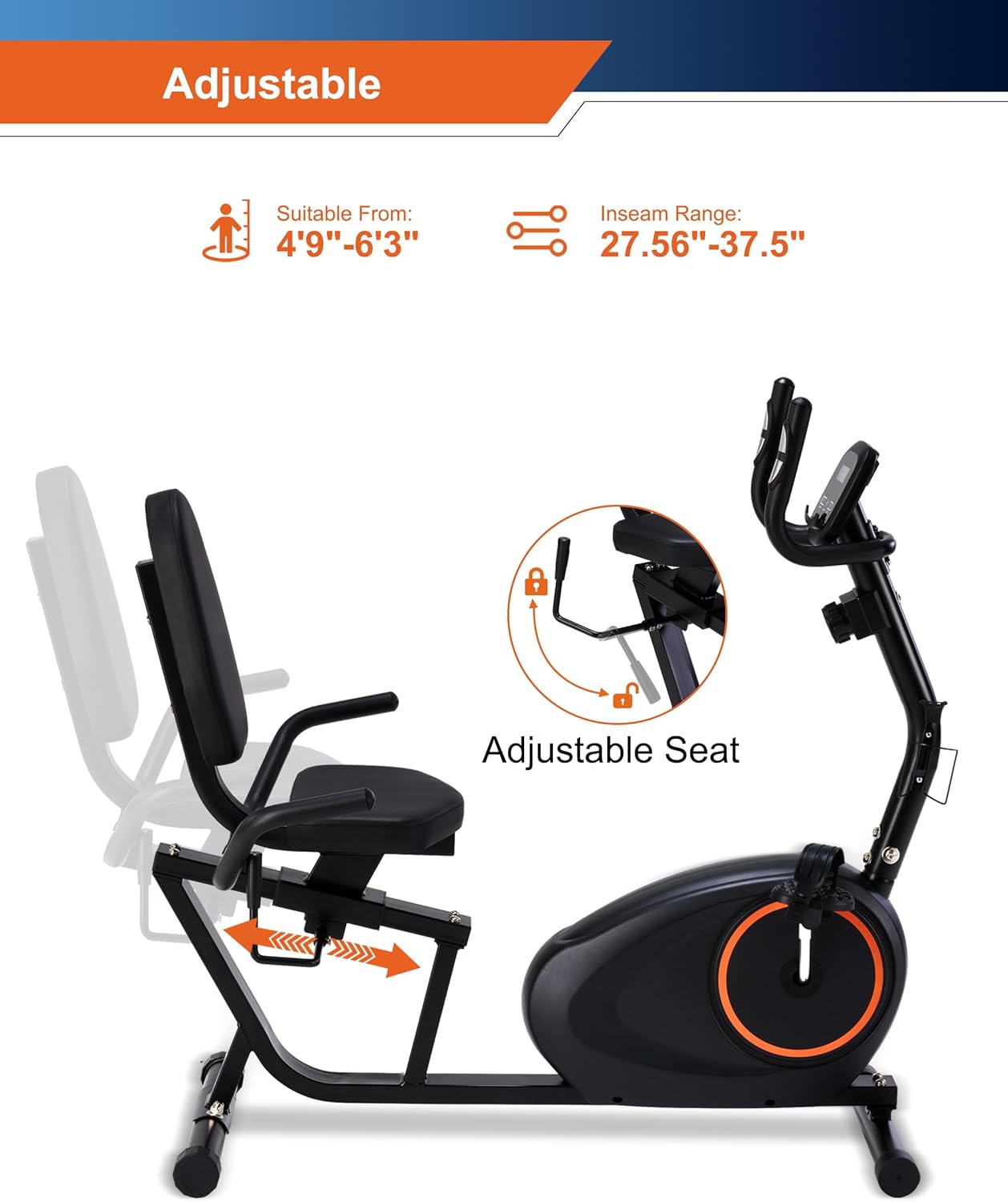 Adjustable Exercise Bike: The seat and backrest adopt a high-quality sports sponge and ergonomic design with a forward tilt of 10°, providing superior comfort during your workout. with our seat adjustment handle, our recumbent bike can be moved forward or backward to accommodate each user’s leg length. (If you have trouble adjusting the seat, please add some lubricating oil)