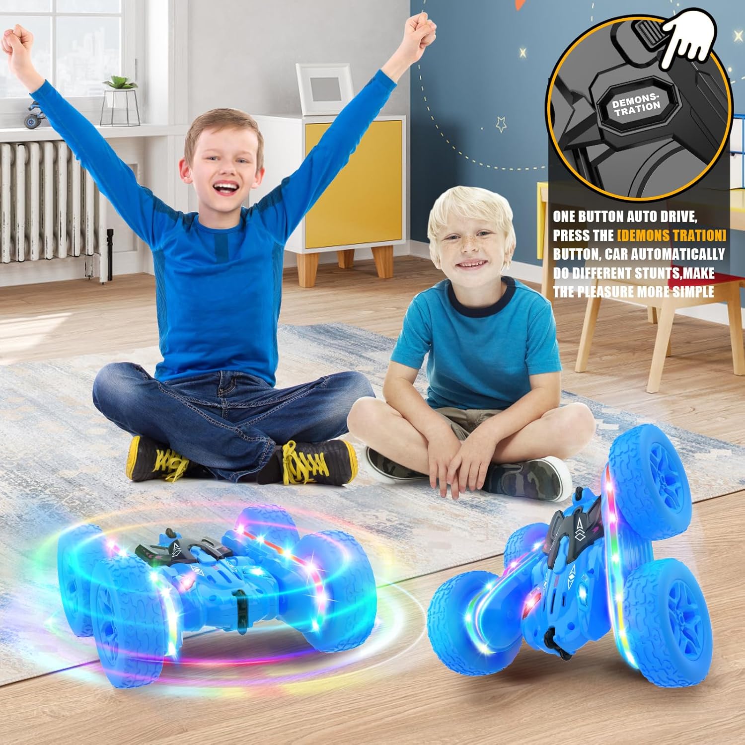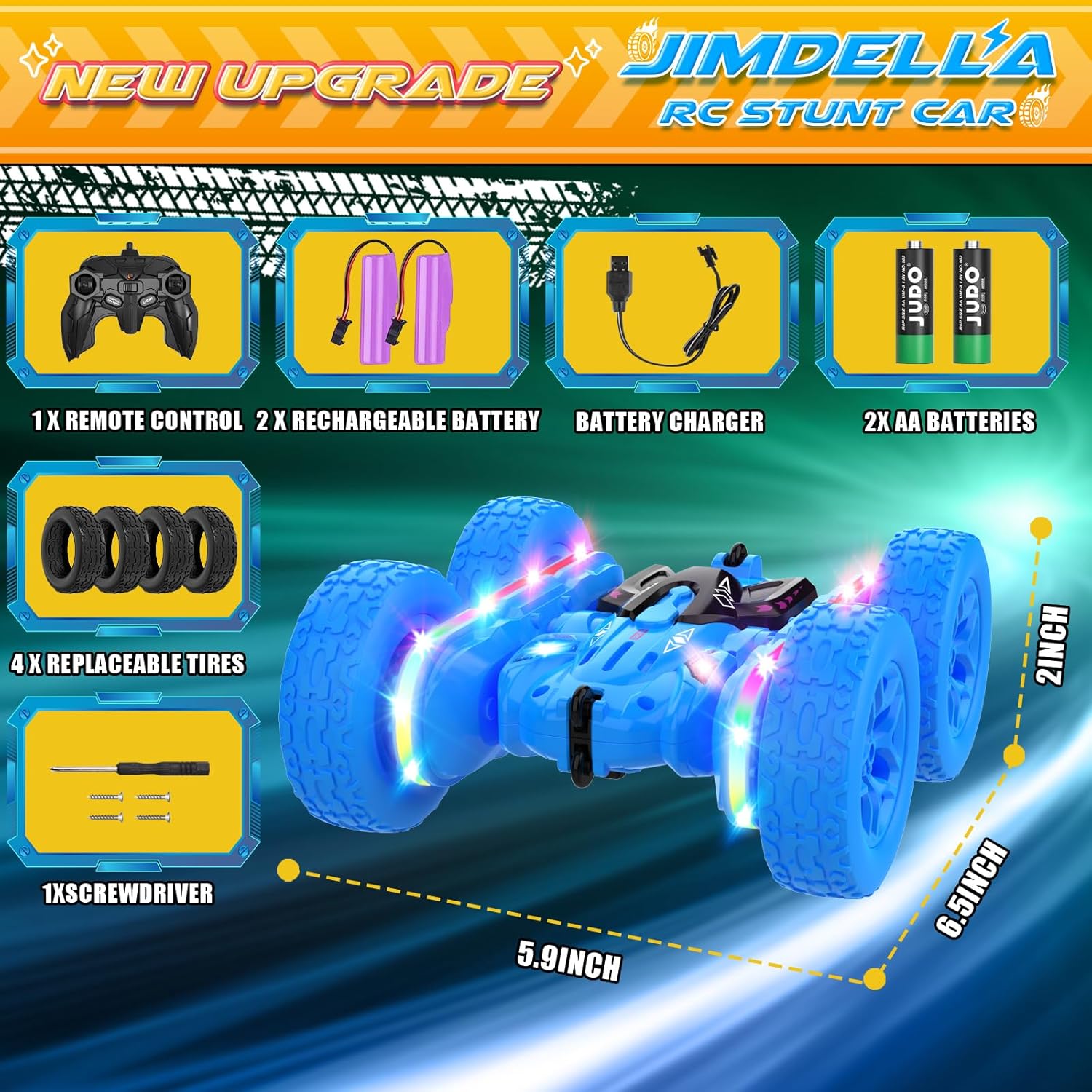 [JIMDELLA REMOTE CONTROL STUNT CAR]-360 Flips Rotating Stunt RC Cars supports a variety of stunts. You can use the controller to control the car forward, backward, left turn, right turn, 360-degree rollover and rotation, bringing you unlimited fun. Both sides of RC Cars are equipped with cool colored headlights and color light strip, which can be turned on and off freely through the remote control.