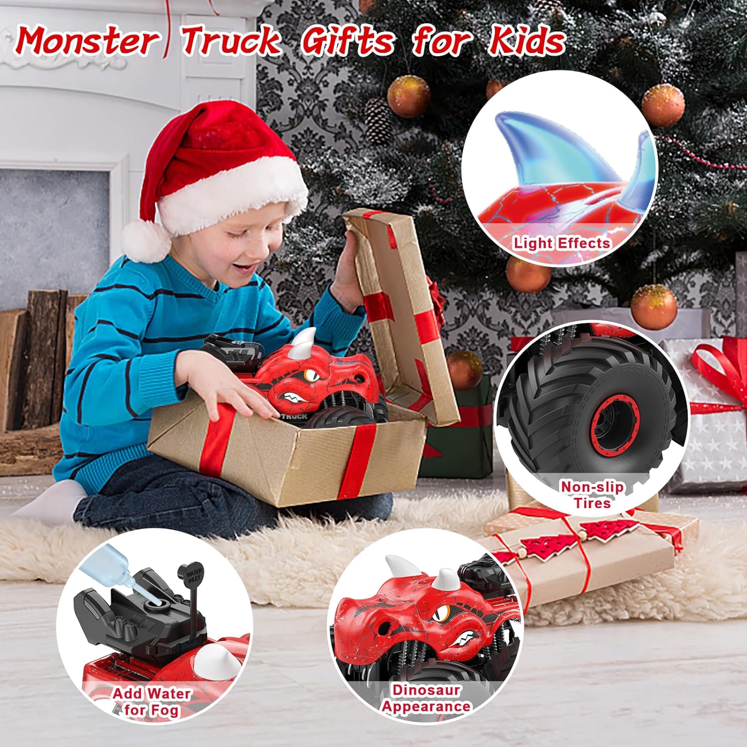 Perfect Gift for Kids: The remote control car is the perfect gift for your kids, especially for those who are 3 4 5 6 7 8 9. It is suitable for both boys and girls who love dinosaurs and cars. Cool lights and spray features make this monster truck a great toy for indoor, outdoor and nighttime play! It also can bring happiness to your kids on any occasion, such as a birthday, Christmas, Halloween, or just for fun.