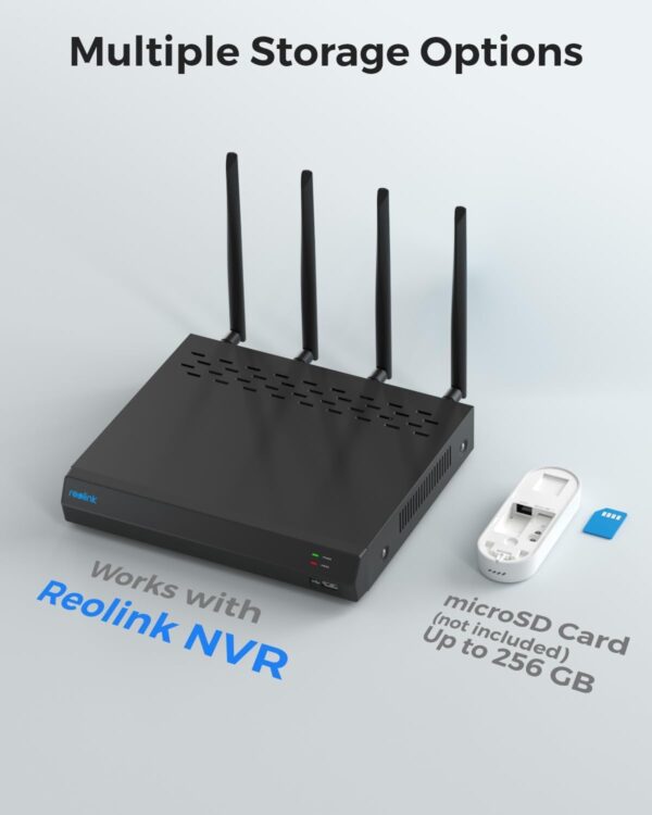 Flexible Storage Options: Recordings can be stored locally and securely on a microSD card slot (max. 256 GB, not included), Reolink NVR with built-in 2/4TB HDD, or FTP/NAS.