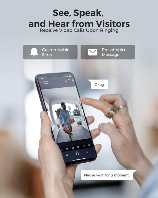 Respond to Visitors Quickly: The doorbell supports visitor detection, ensuring you promptly receive video calls and push notifications upon ringing. Engage in two-way communications or respond with pre-recorded voice messages when you’re busy, so you’ll never miss a visitor.