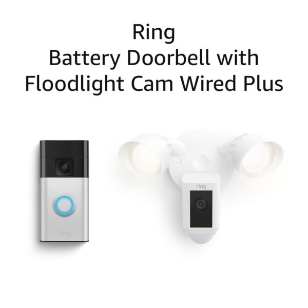 This bundle contains Ring Battery Doorbell and Ring Floodlight Cam Wired Plus (White)