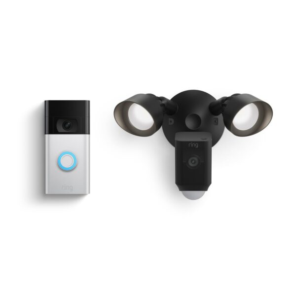 This bundle contains one Ring Floodlight Cam Wired Plus (Black) and one Ring Video Doorbell (Satin Nickel).