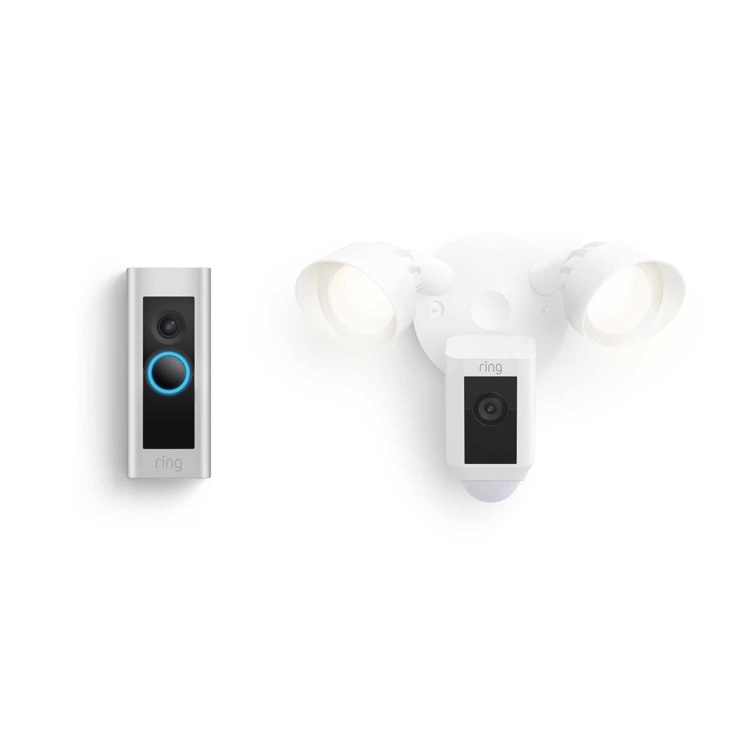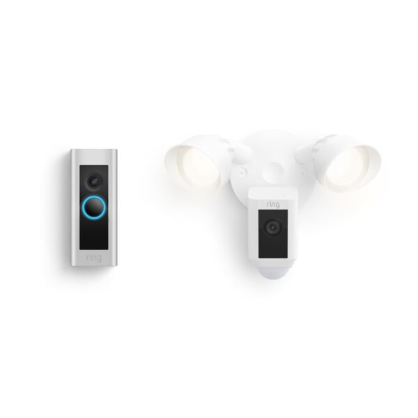 This bundle contains one Ring Wired Doorbell Plus with one Ring Floodlight Cam Plus, White