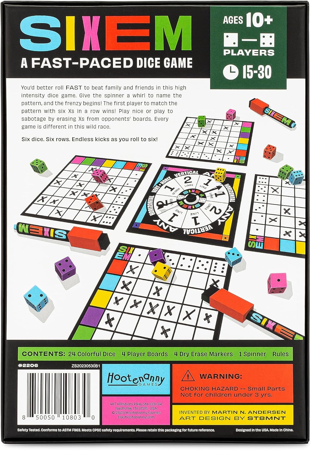 INTRODUCING SIXEM: A DICE GAME LIKE NO OTHER! Prepare for hours of excitement with SIXEM, the newest creation from Hootenanny Games. Perfect for 2 player games up to 4 players and ages 10 and up, this game combines strategy, speed, and sabotage to create a thrilling experience for family and friends
