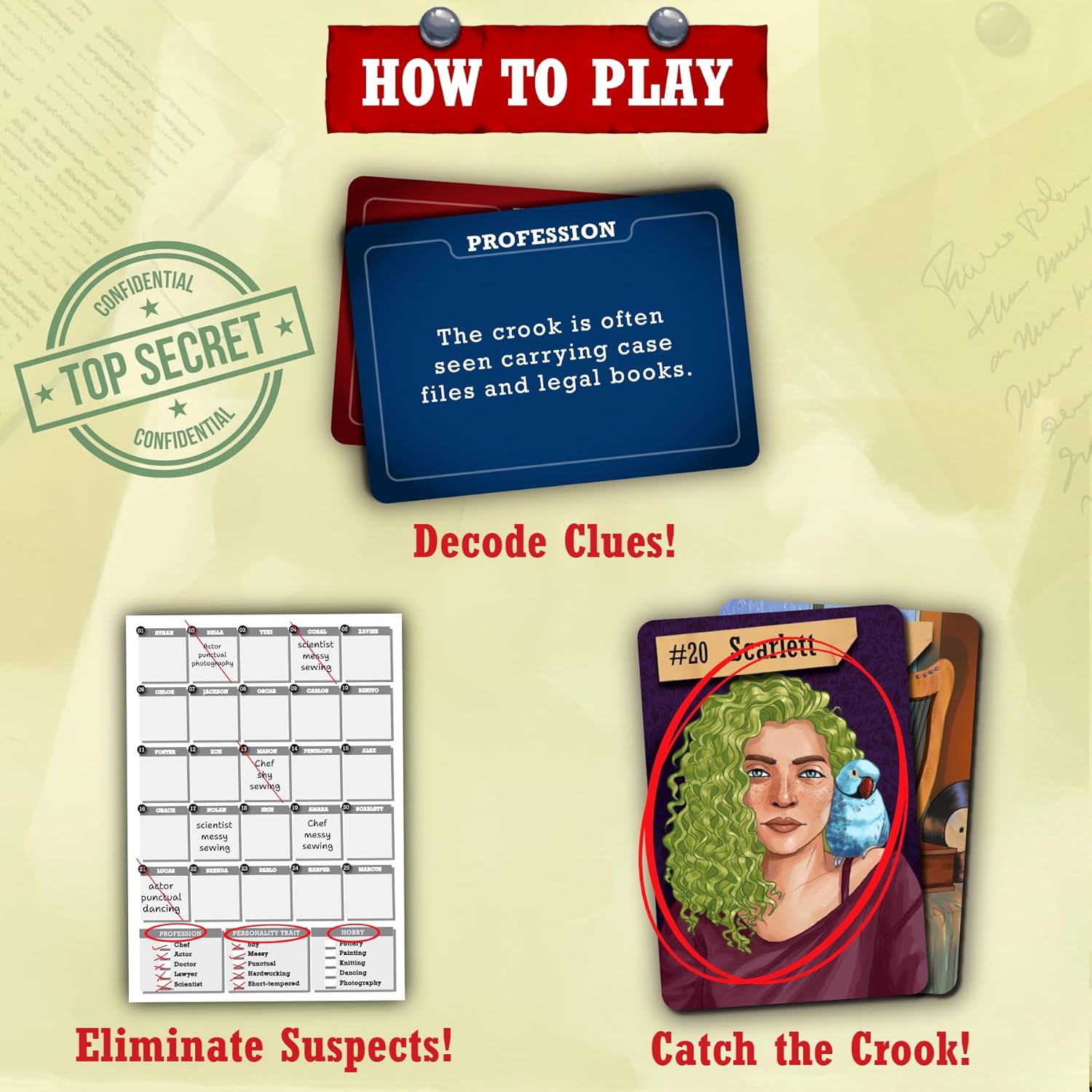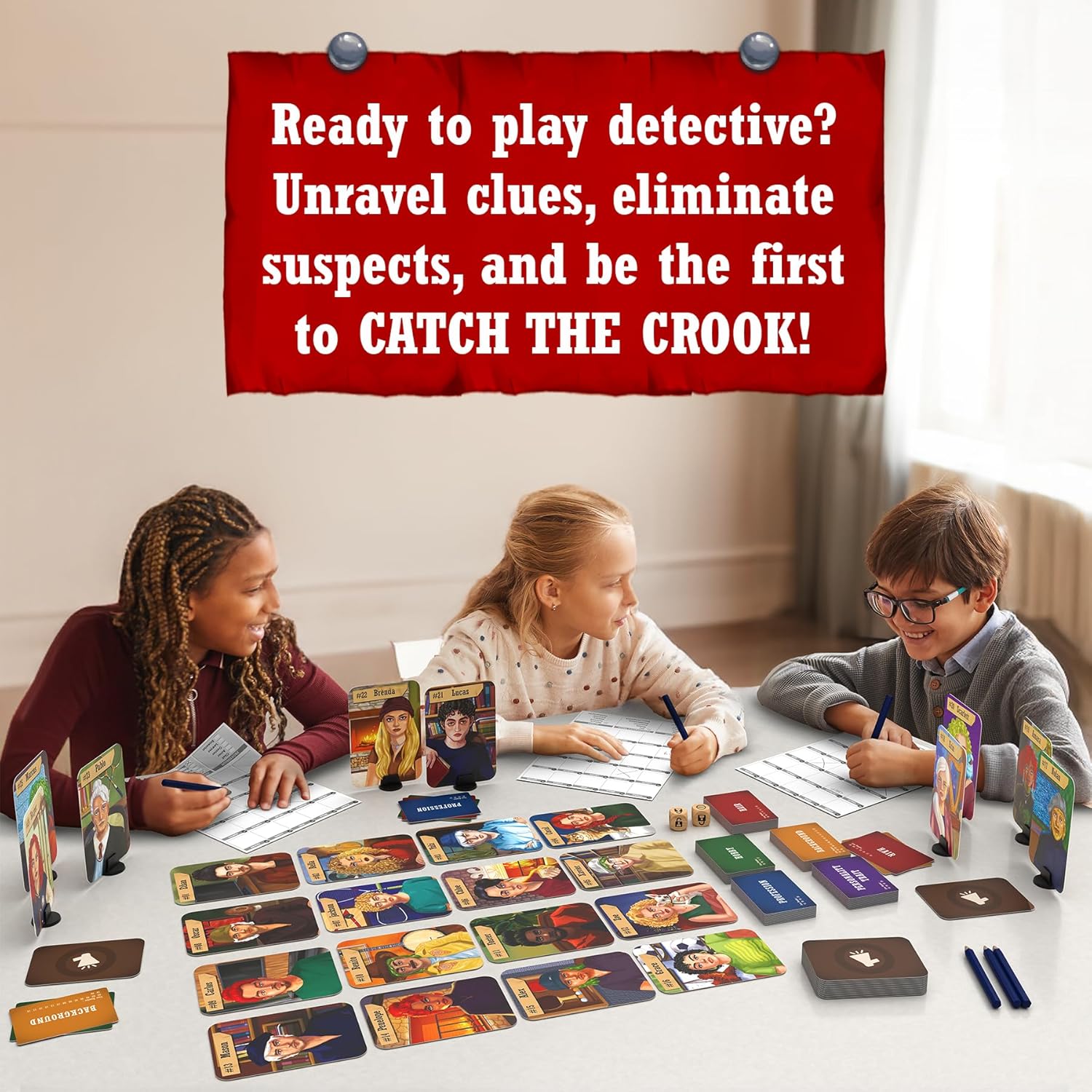 HOW TO WIN: Unravel clues, eliminate suspects, and use your wits to be the first to Catch the Crook!
