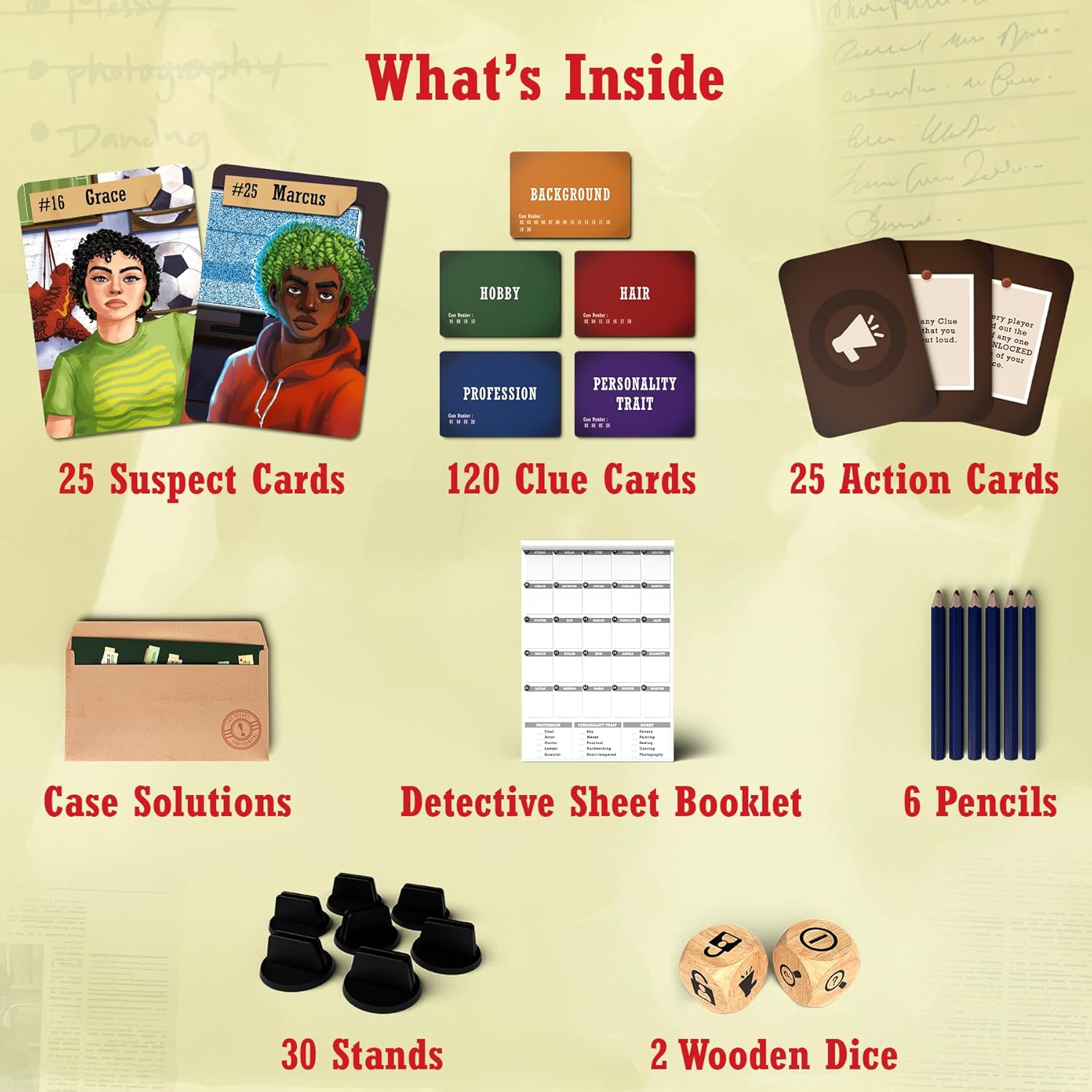 WHAT’S INSIDE: 25 Suspect Cards, 120 Clue Cards, 25 Action Cards, 1 Detective Sheet Booklet, Case Solutions, 30 Stands, 2 Wooden Dice, 6 Pencils, and an Instruction Manual.